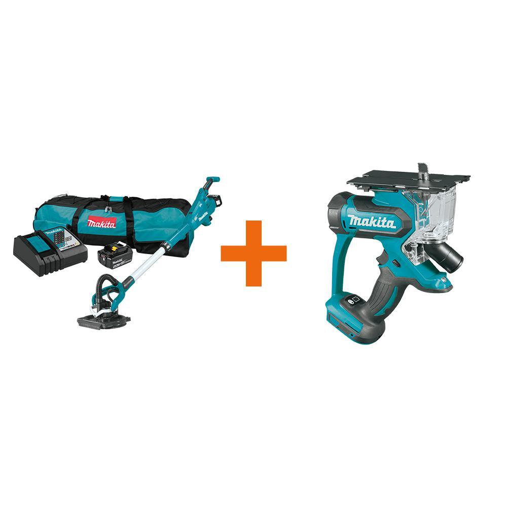 Makita 18V LXT Brushless Cordless 9 in. Drywall Sander Kit, AWS Capable (XLS01T) delivers increased efficiency and mobility for drywall finishers. The compact and lightweight design make the XLS01 easier to use for extended periods of time. The XLS01T delivers up to 35-minutes of run time on a single charge of an 18V 5.0 Ah battery. Users can match the speed to the application with a variable speed control dial (1,000 RPM to 1,800 RPM) and Constant Speed Control automatically provides additional power to the motor to maintain speed under load for consistent performance. The large highly flexible head is engineered for efficient for increased maneuverability across various wall orientations. The direct-drive BL Brushless Motor eliminates carbon brushes, enabling the motor to run cooler and more efficiently for longer life. The adjustable extension pipe collapses for sanding in confined spaces, such as closets and extends up to 16-1/2 in. for reaching high walls and ceilings. The dust brush is removable for seamless flush-to-corner edge sanding. For improved efficiency, its equipped with Auto-Start Wireless System technology (AWS). AWS utilizes Bluetooth technology for wireless communication between the tool and dust extractor (sold separately). This Promotion also comes with a bonus XDS01Z 18V LXT Lithium-Ion Cordless Cut-Out Saw, Tool Only.