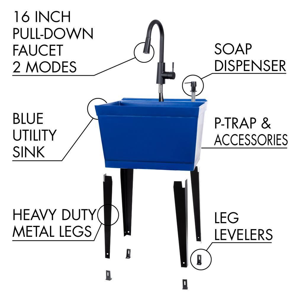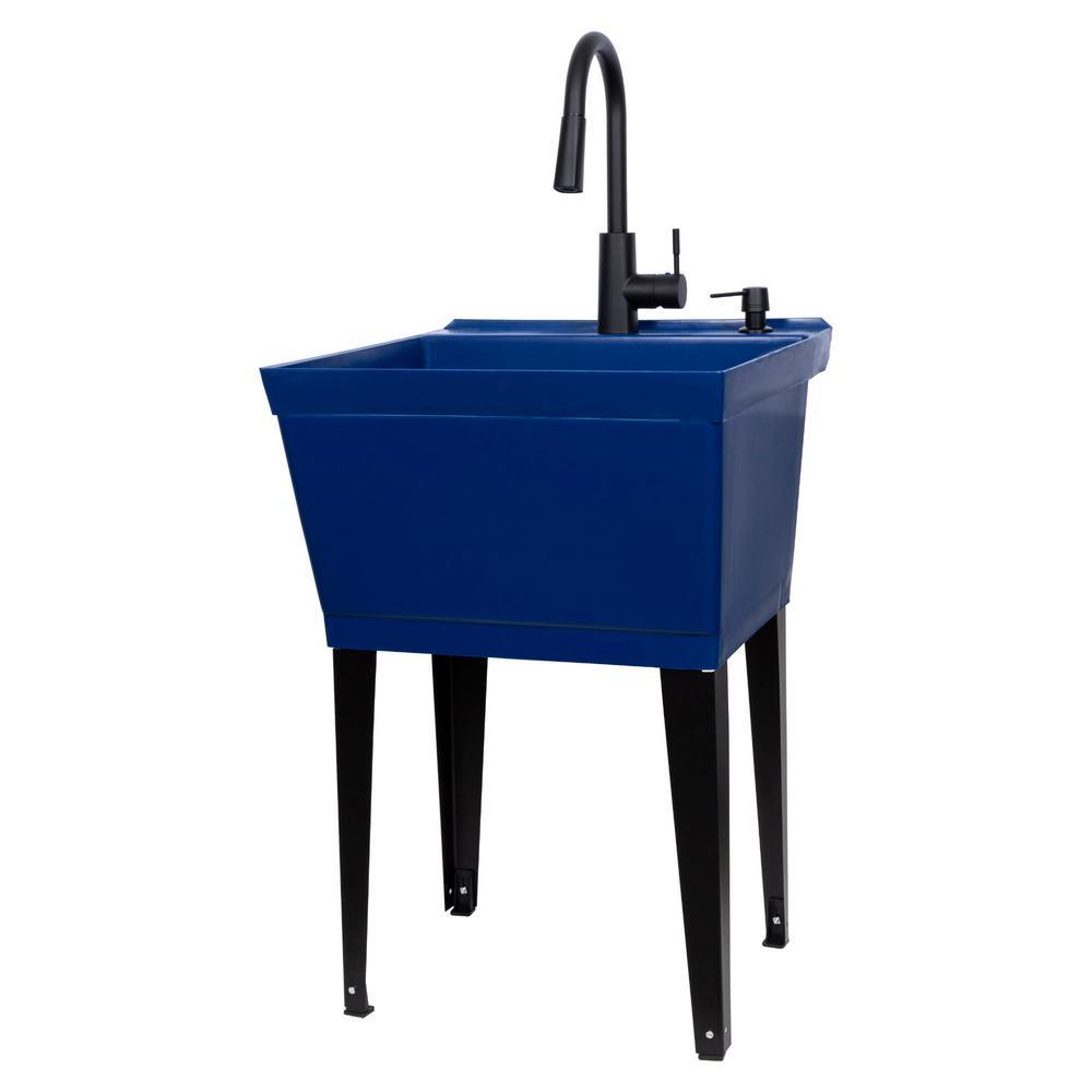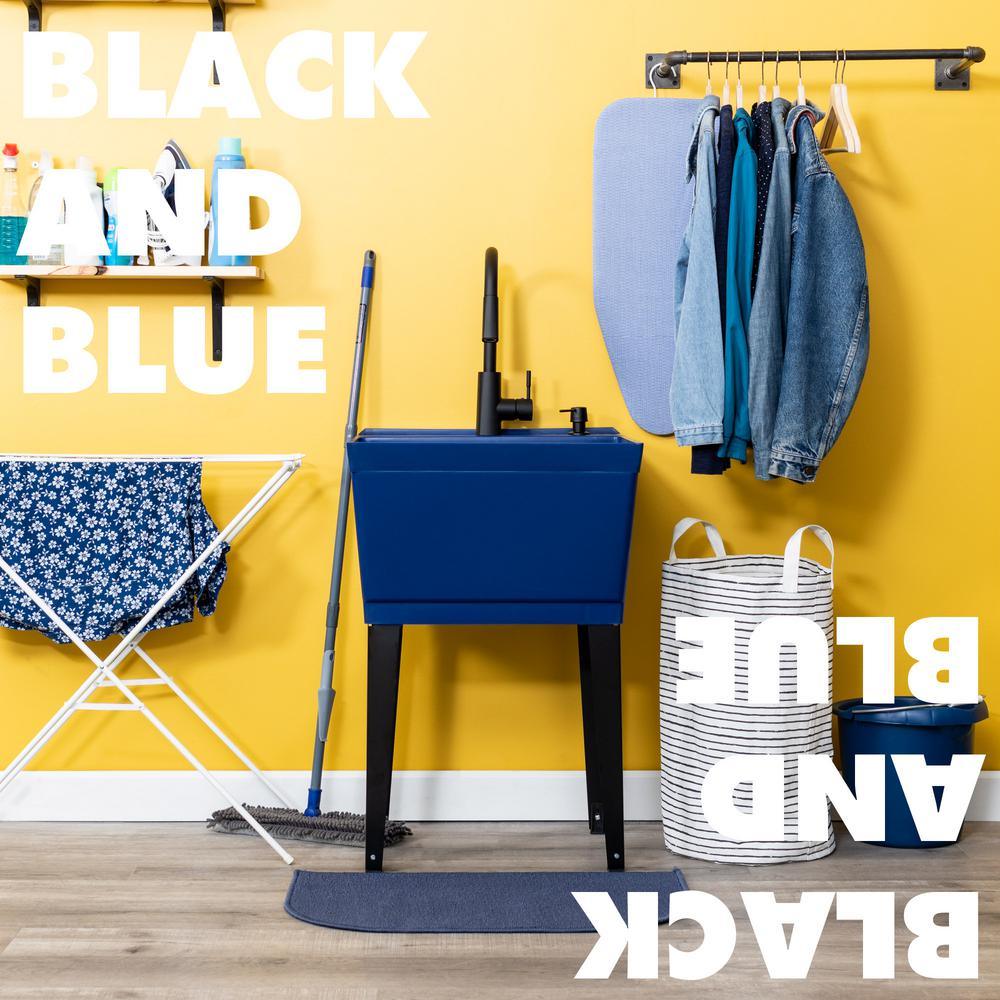 Our cutting-edge blue utility sink with a sleek black high-arc faucet, matching soap dispenser and black metal legs will add a touch of color and fun to any laundry area or utility room. This 6507 series laundry tub set comes complete with tub, high-arc pull-down faucet with integrated supply lines, matching soap dispenser, legs, drain stopper, p-trap, floor levelers, hardware and installation instructions. The faucet features a two-function pull-down sprayer that perfectly matches the soap dispenser and legs. The 19-gal. tub is made of high-quality durable thermoplastic construction with a stain-resistant wipe clean surface. Sturdy rust-proof metal legs attach easily and the included floor levelers increase stability on uneven surfaces. One-year limited warranty.