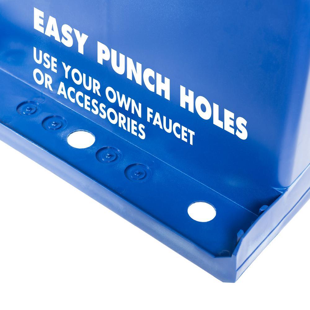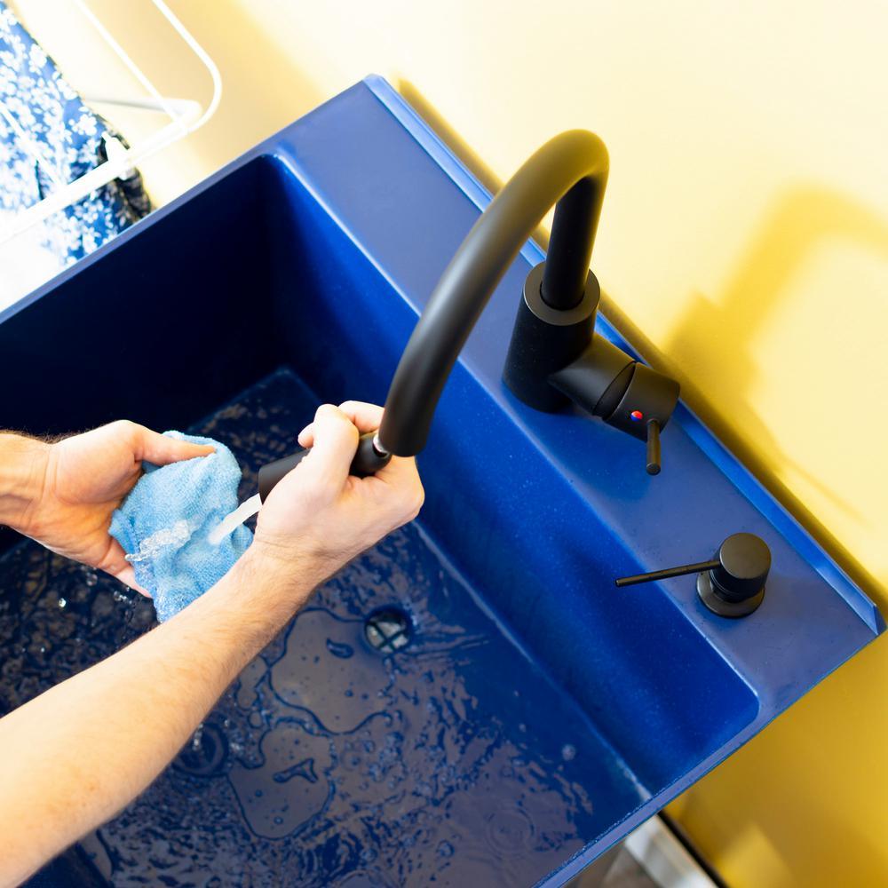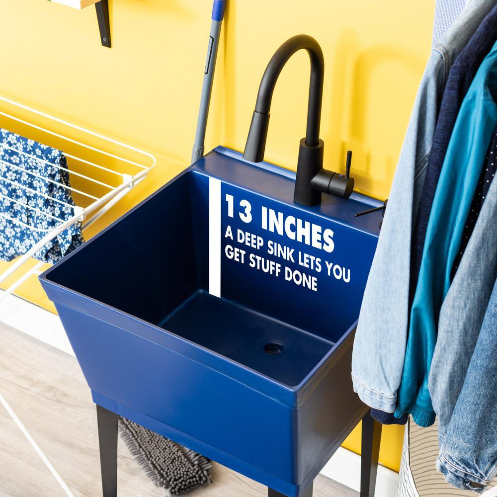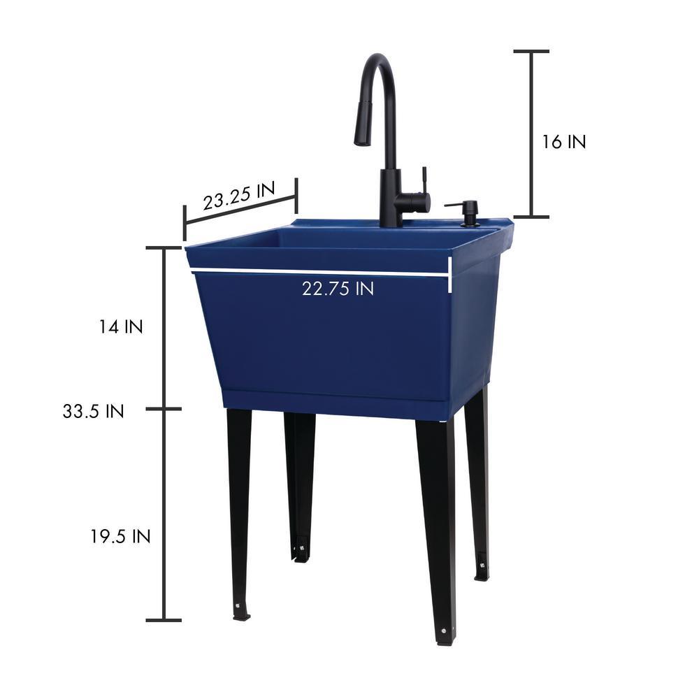 Our cutting-edge blue utility sink with a sleek black high-arc faucet, matching soap dispenser and black metal legs will add a touch of color and fun to any laundry area or utility room. This 6507 series laundry tub set comes complete with tub, high-arc pull-down faucet with integrated supply lines, matching soap dispenser, legs, drain stopper, p-trap, floor levelers, hardware and installation instructions. The faucet features a two-function pull-down sprayer that perfectly matches the soap dispenser and legs. The 19-gal. tub is made of high-quality durable thermoplastic construction with a stain-resistant wipe clean surface. Sturdy rust-proof metal legs attach easily and the included floor levelers increase stability on uneven surfaces. One-year limited warranty.