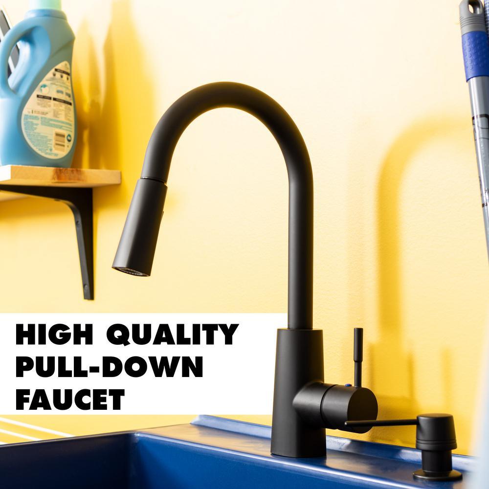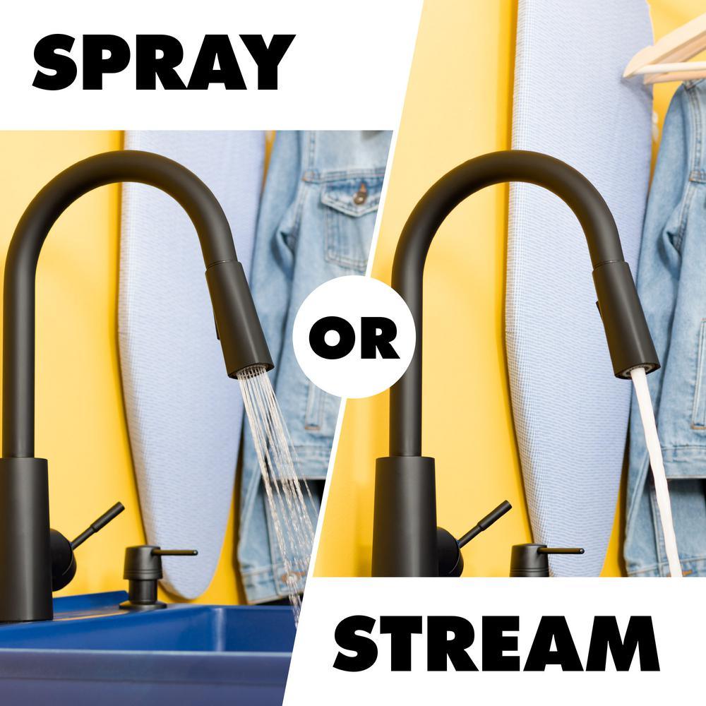 16 in. high arc pull down faucet with dual function spray or water stream and matching soap dispenser