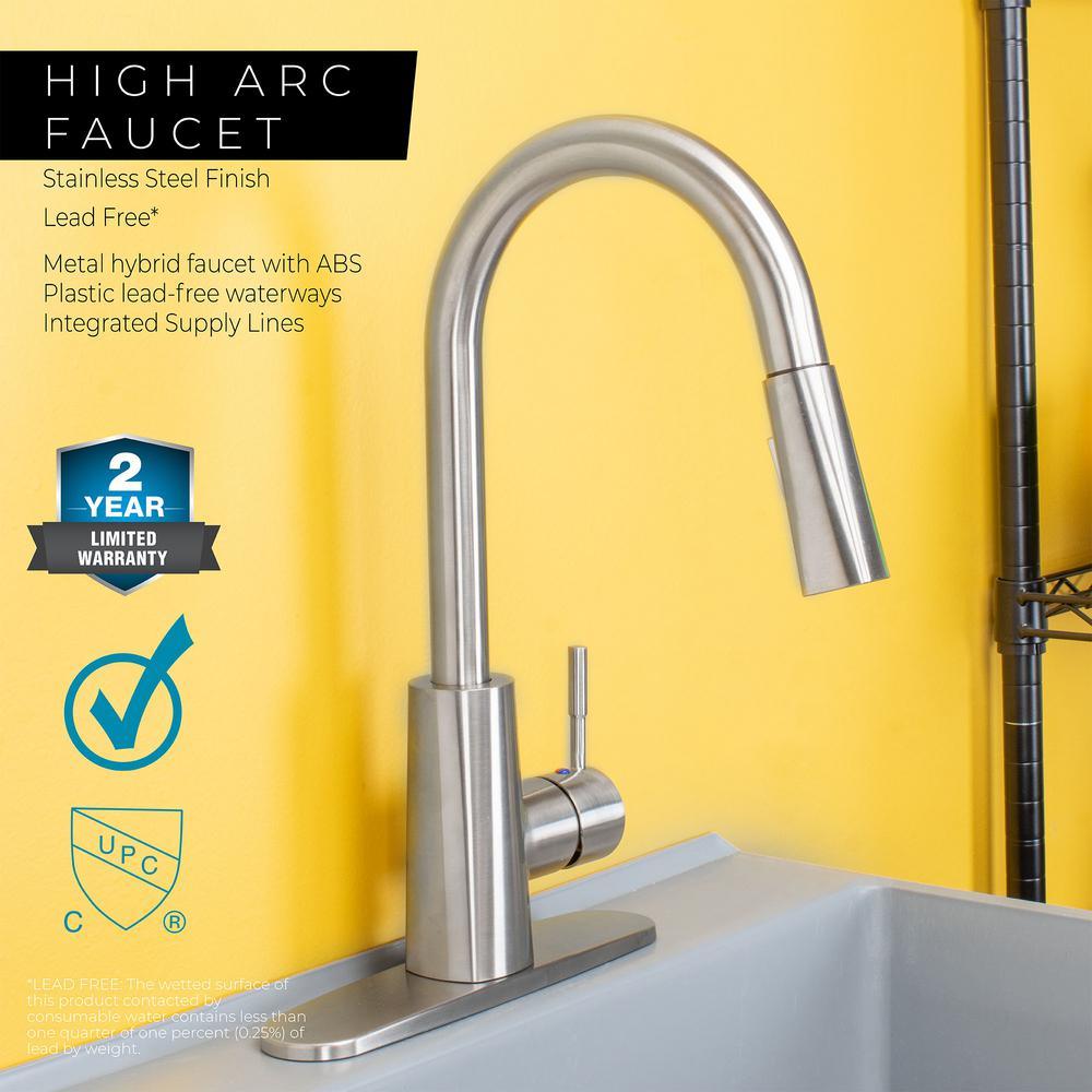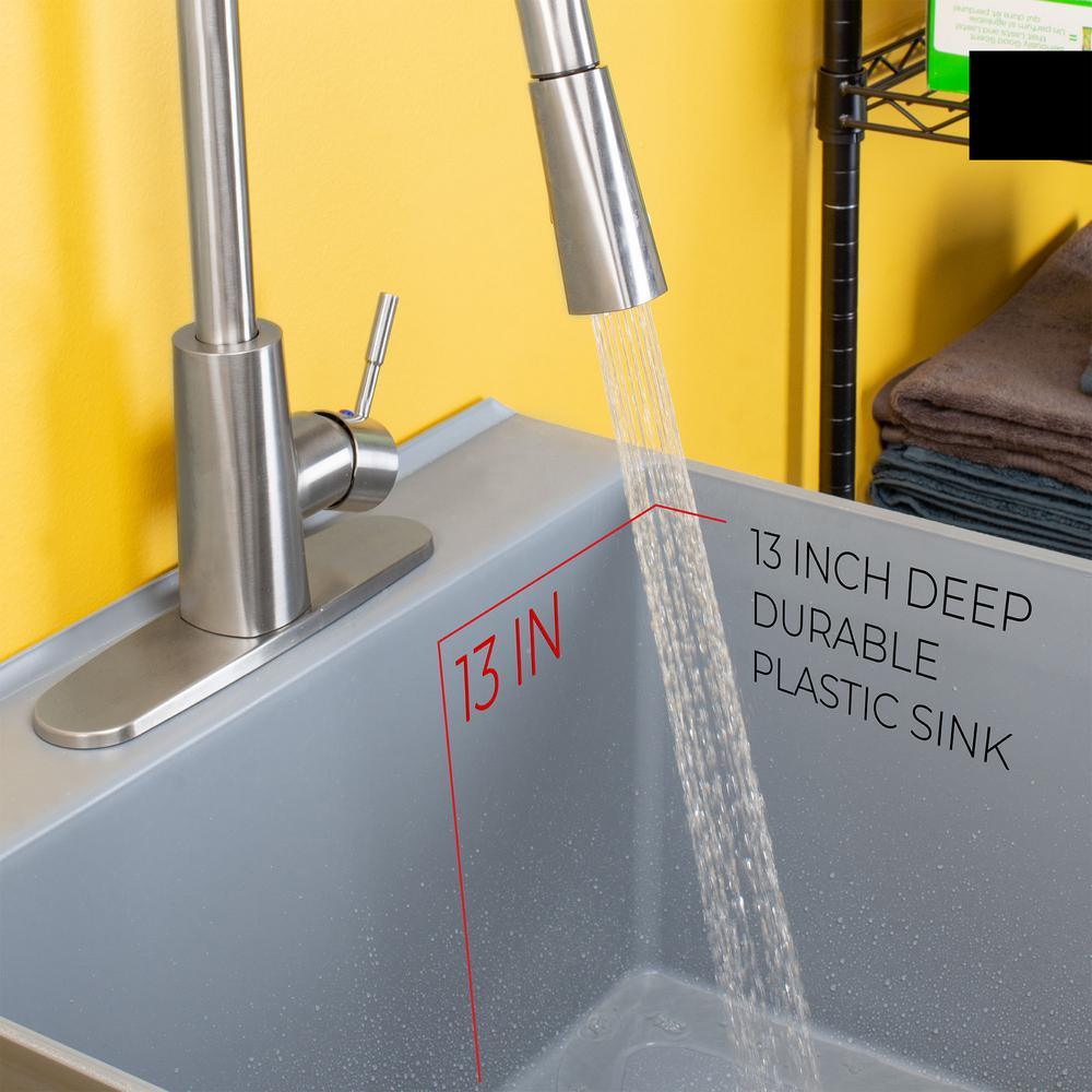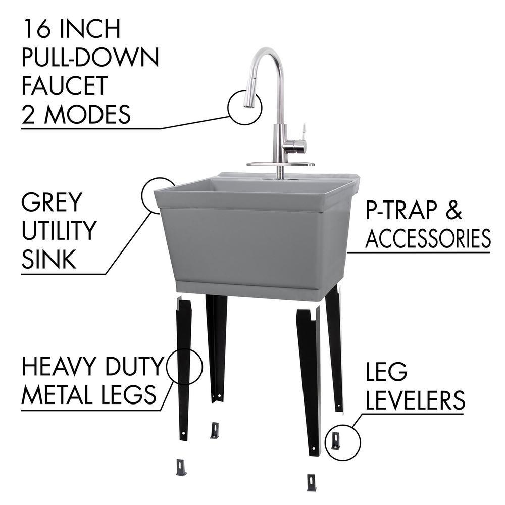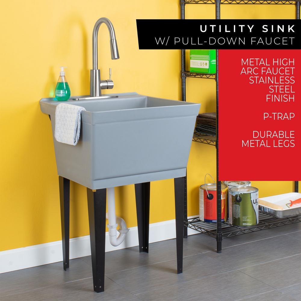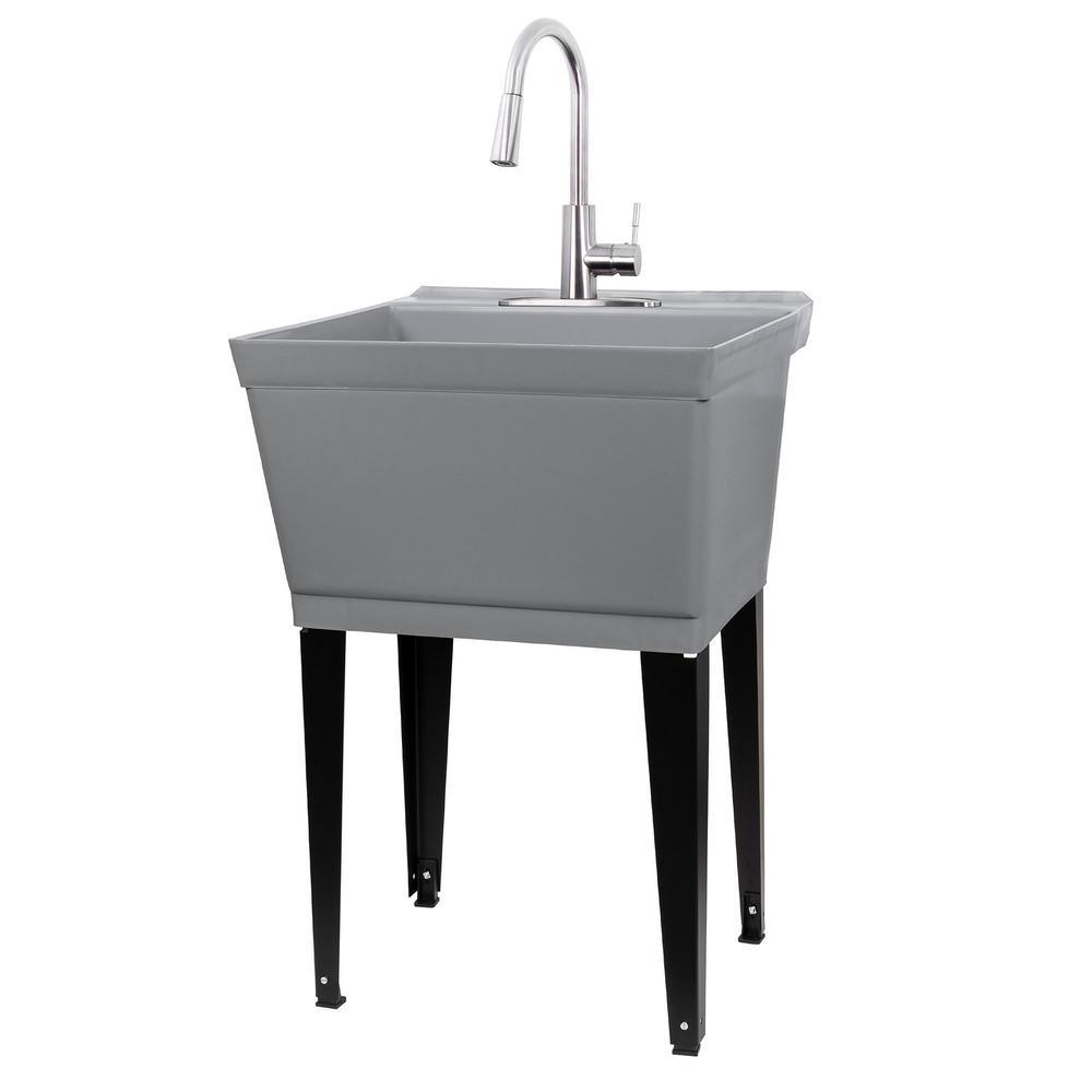 Our classic grey utility sink paired with a quality stainless steel finish high-arc faucet and black metal legs will lend a stylish touch to any laundry area or utility room. This 6503 series laundry tub set comes complete with tub, high arc-pull-down faucet with integrated supply lines, legs, rubber stopper, p-trap, floor levelers, hardware, and installation instructions. Use the pull-out nozzle on the kitchen-grade faucet to direct the water where you need it to go or move the spout out of the way completely so you can easily wash your bulky items. This extra-deep 19 Gal. tub is made of high-quality durable thermoplastic construction and has a stain-resistant wipe clean surface. Sturdy rust-proof metal legs attach easily, and the included floor levelers increase stability on uneven surfaces. One-year limited warranty.