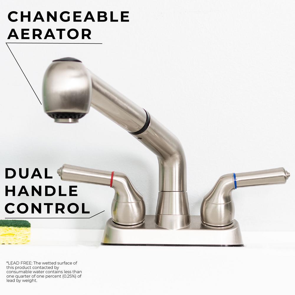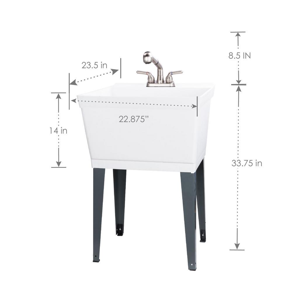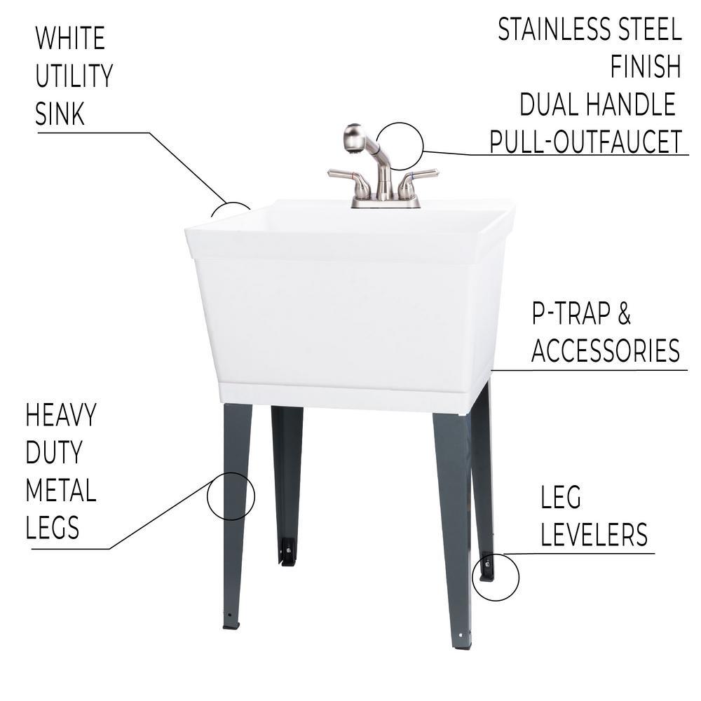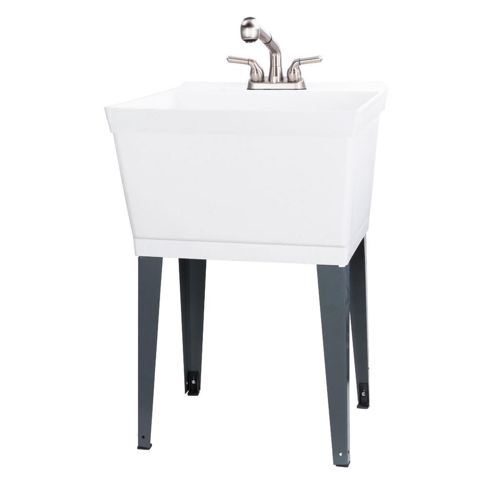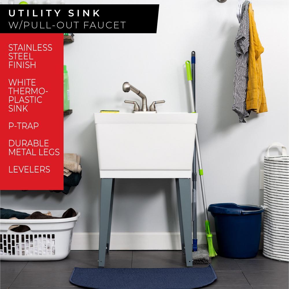 Our most popular utility sink set now with pullout faucet in a stainless-steel finish. This 6000 series laundry tub set comes complete with tub, faucet, legs, rubber stopper, supply lines, p-trap, floor levelers, hardware, and installation instructions. The faucet features a pullout two-function spray, dual handles, and is constructed of a combination of metal and ABS plastic exterior. Our extra-deep 19 gal. tub is made of high-quality durable thermoplastic and features a stain-resistant wipe clean surface. Sturdy rust-proof metal legs attach easily, and the included floor levelers increase stability on uneven surfaces. 1-year limited warranty.