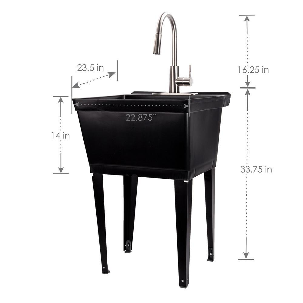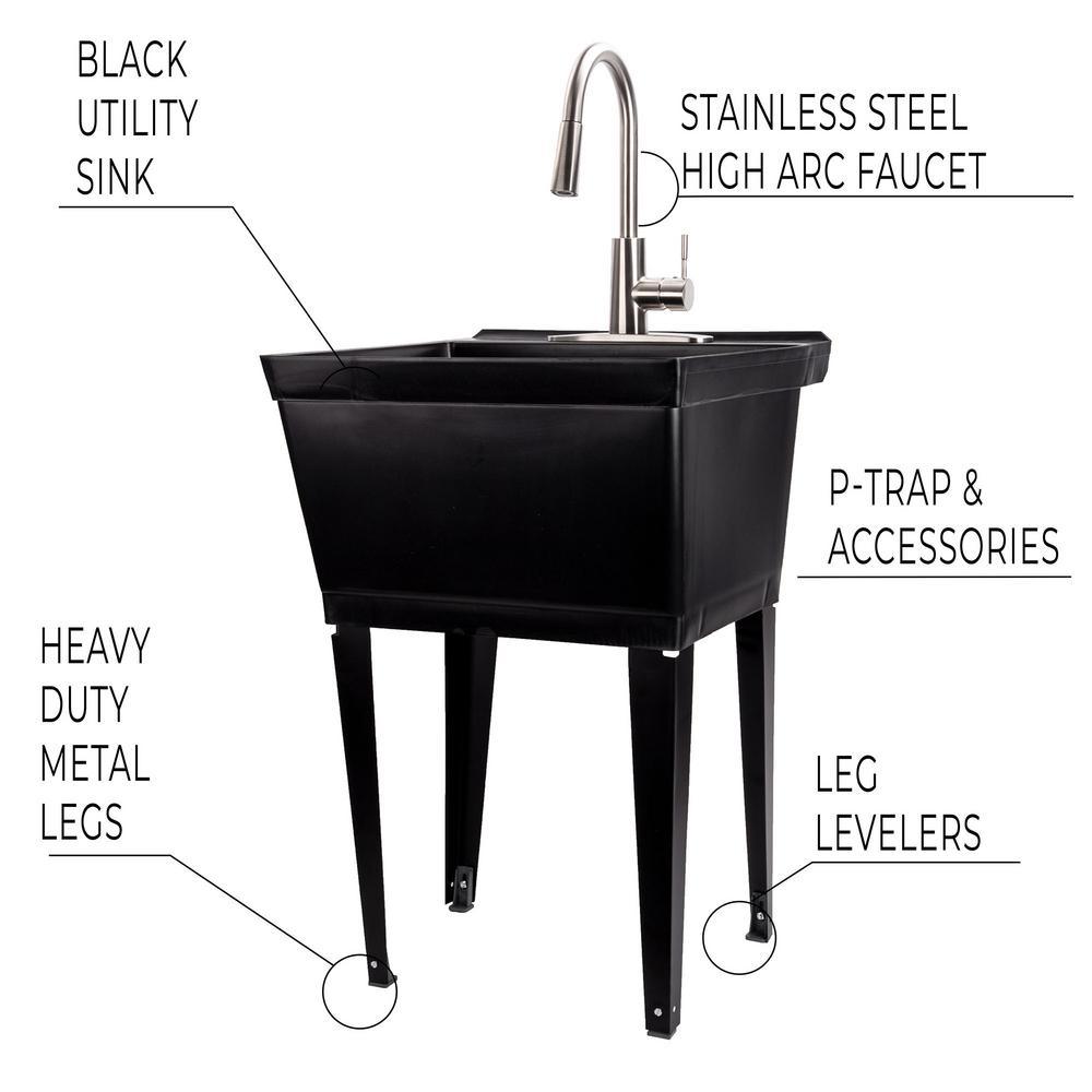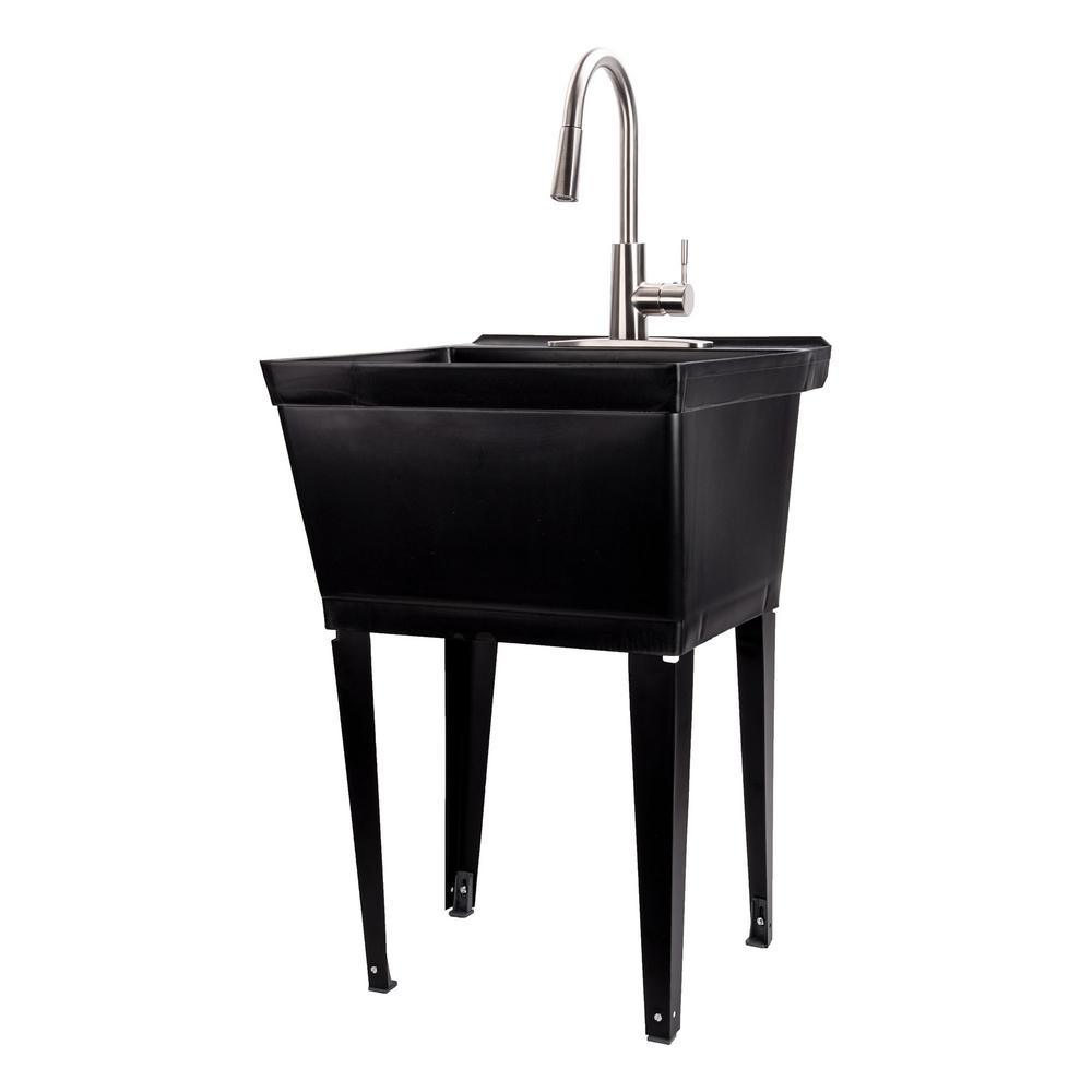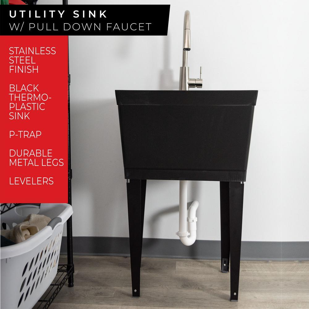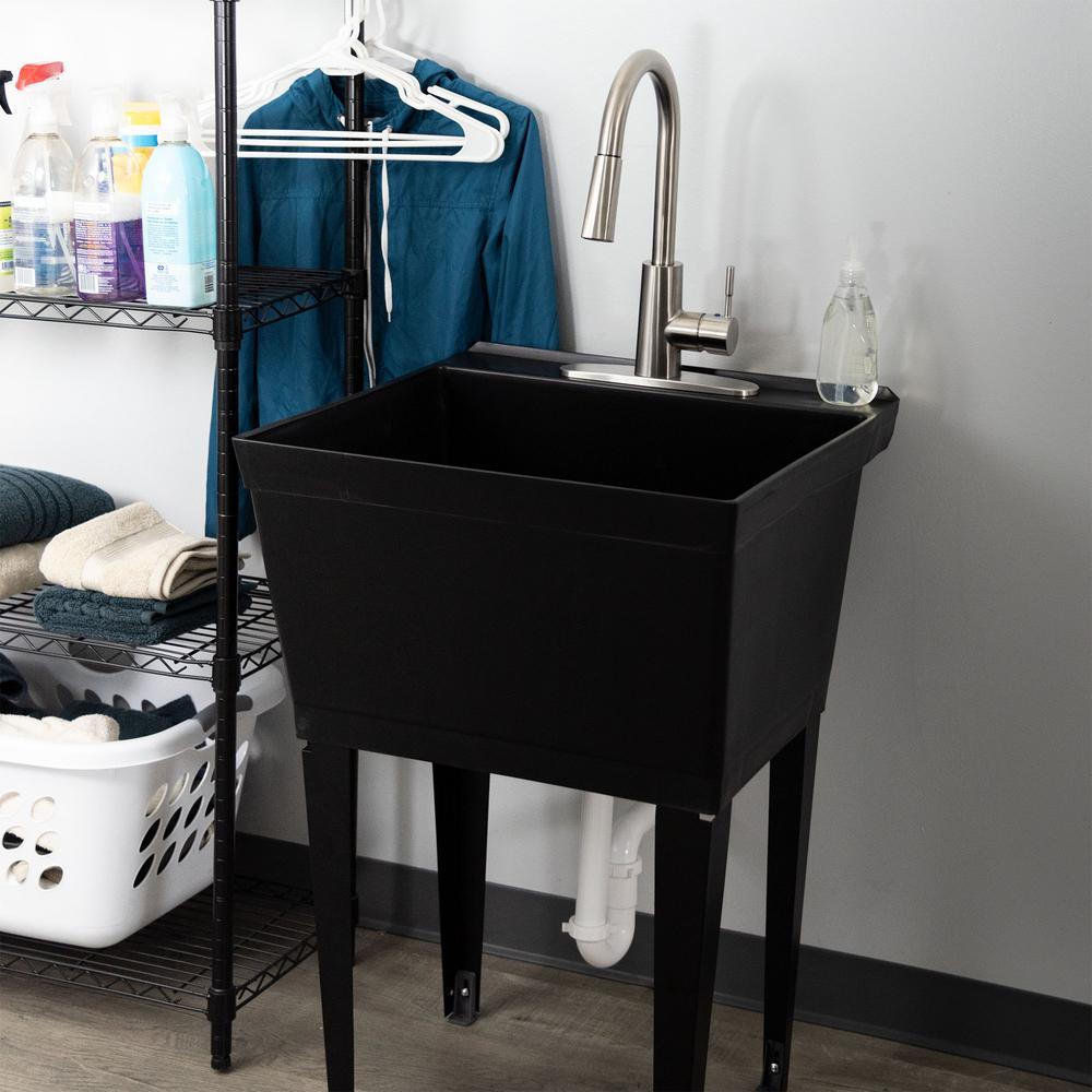 Our classic utility sink set in elegant black paired with a high-grade kitchen quality brushed stainless-steel pull-down faucet. This 6503 series laundry tub set comes complete with tub, legs, drain cover, faucet with integrated supply lines, p-trap, floor levelers, hardware, and installation instructions. The faucet features a high-arc design, pull-down dual function faucet head and quality metal construction. Our extra-deep 19 Gal. tub is made of high-quality durable thermoplastic and features a stain-resistant wipe clean surface. Sturdy rust-proof metal legs attach easily, and the included floor levelers increase stability on uneven surfaces. One-year limited warranty.