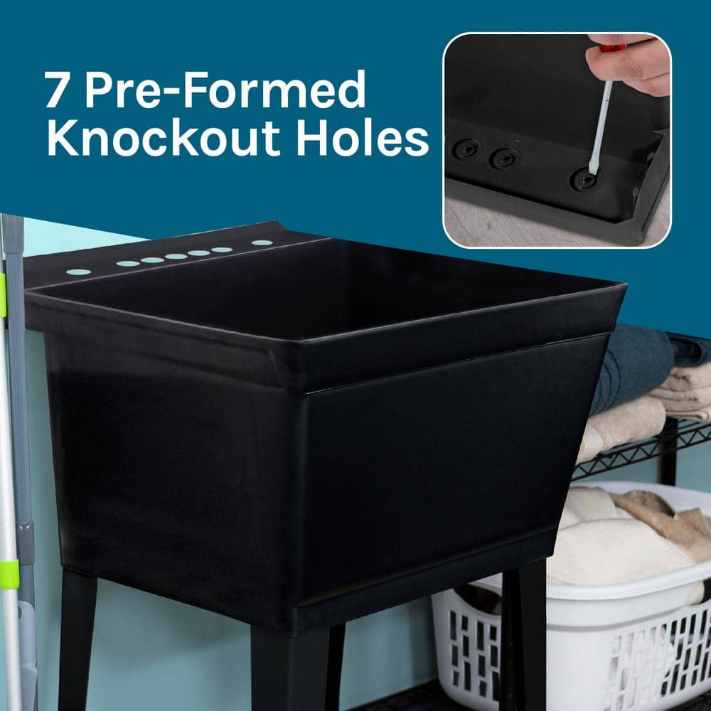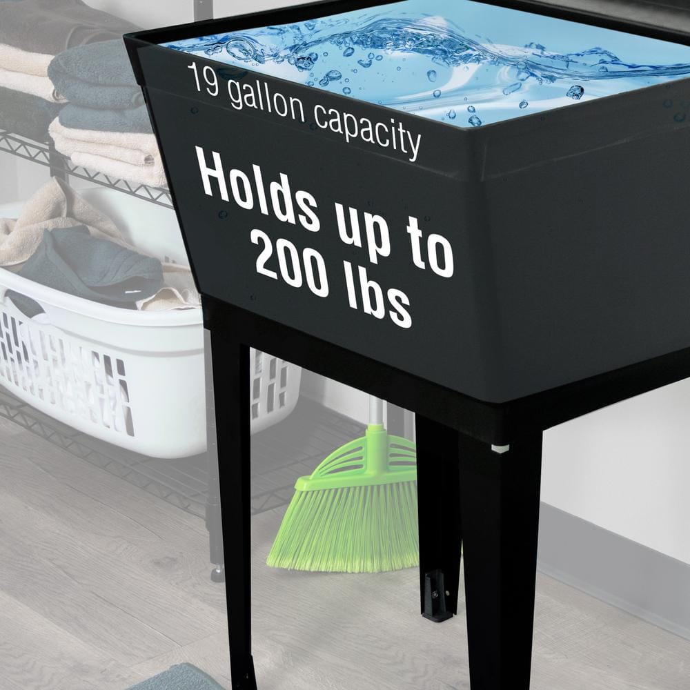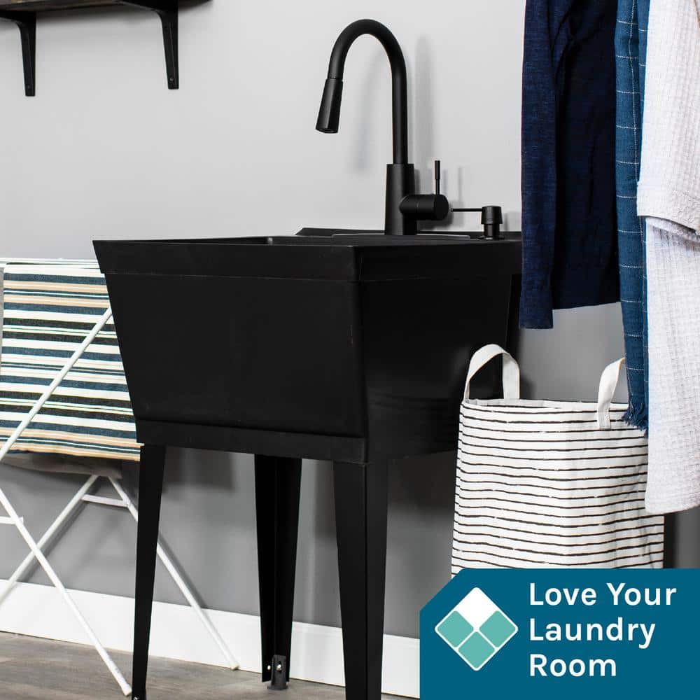 The TEHILA 19 Gallon Utility Sink is a stylish and durable solution for laundry rooms, featuring a black thermoplastic tub paired with a matte black high arc faucet and soap dispenser. Its 19-gallon capacity and versatile design accommodate large cleaning tasks, while adjustable steel legs ensure stable freestanding installation.