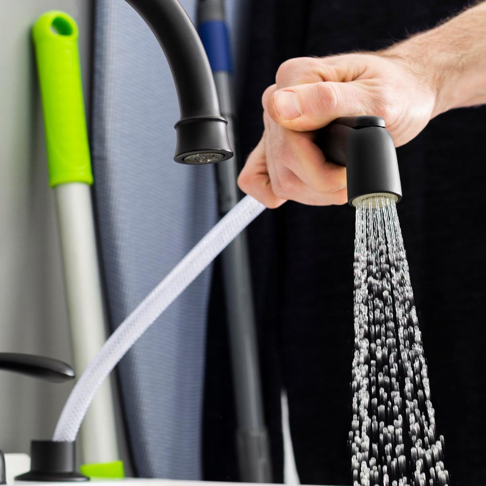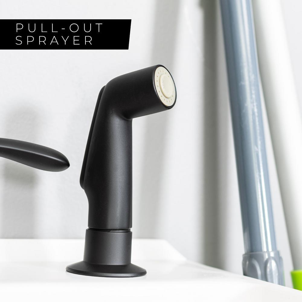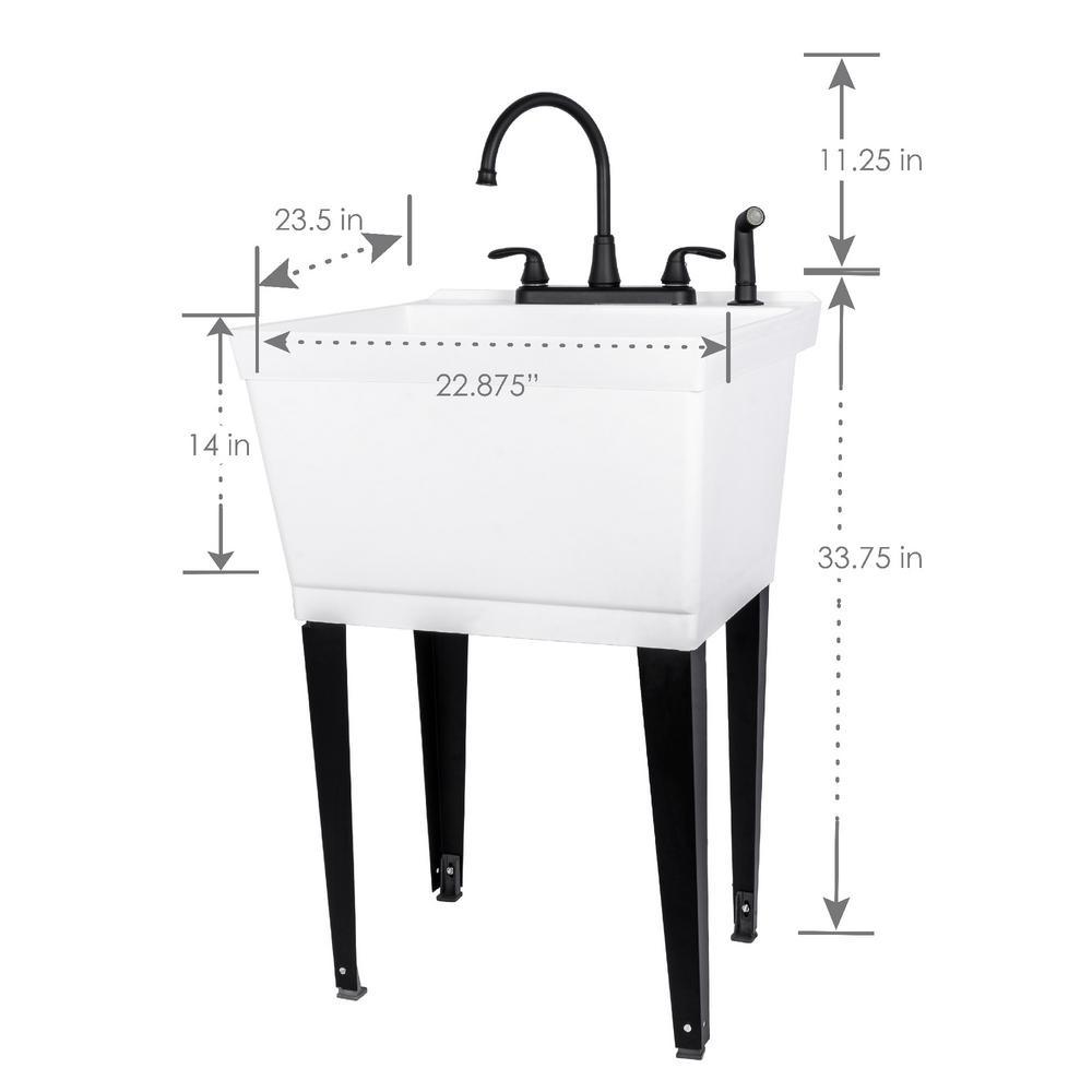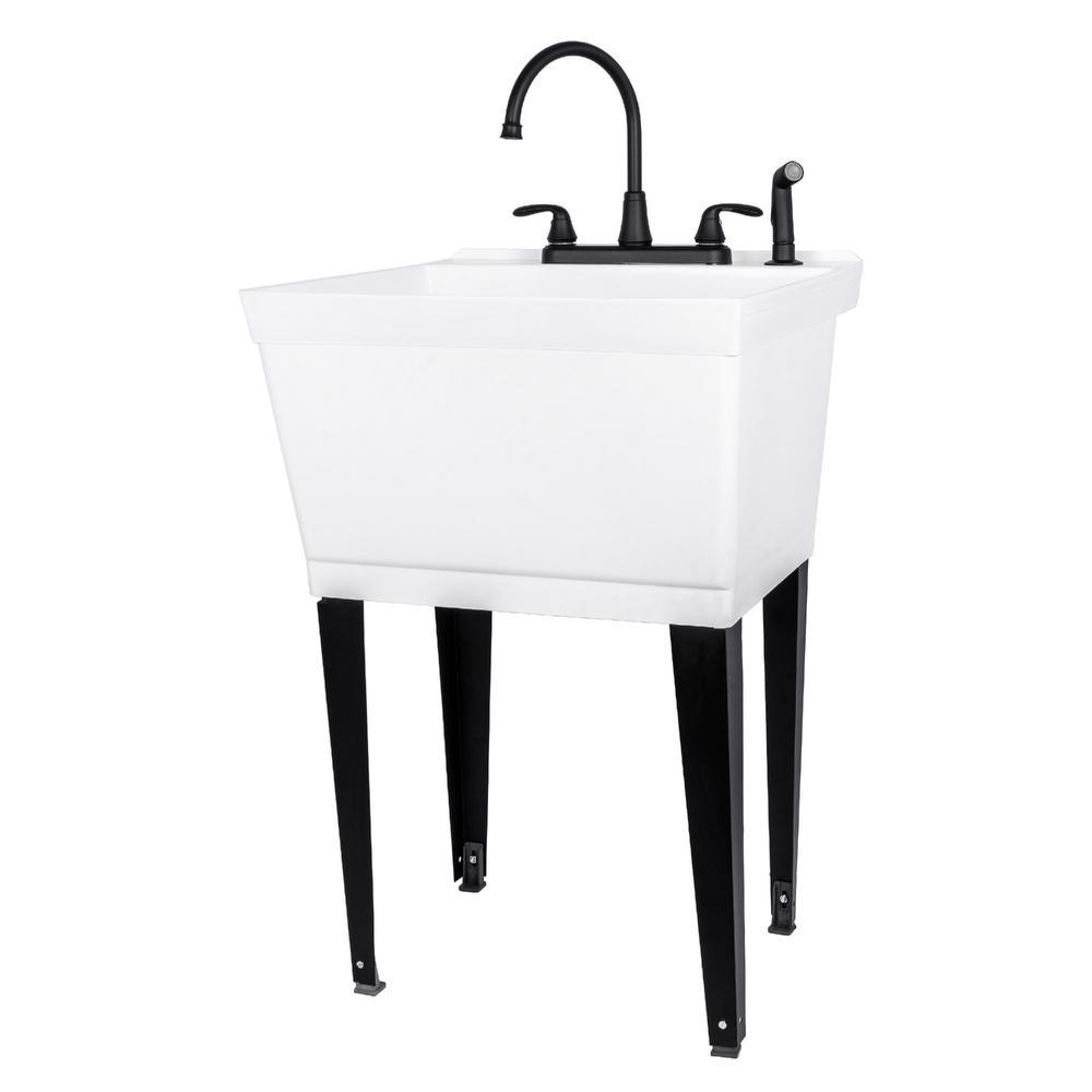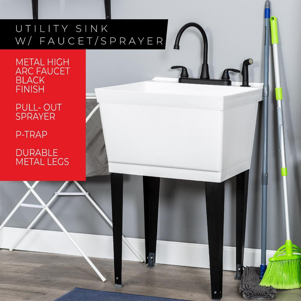 Our white 19 Gal. utility sink is constructed from high quality, durable thermoplastic to accommodate all your scrubbing and soaking needs. The sleek yet sturdy, high-arc faucet with modern black matte finish, helps accommodate buckets and taller items. Use the convenient, matching side sprayer to direct water where you need it to go. Kit includes everything necessary for standard installations; tub, plastic drainage kit (P-trap, nuts, and washers), rubber stopper, high-arc dual handle faucet, side sprayer, legs with levelers, supply lines, thread seal tape and easy to follow installation instructions. Sturdy rust-proof metal legs attach easily, and the included floor levelers increase stability on uneven surfaces. Our extra-deep 19 Gal. tub features a stain-resistant wipe clean surface. One-year limited warranty.