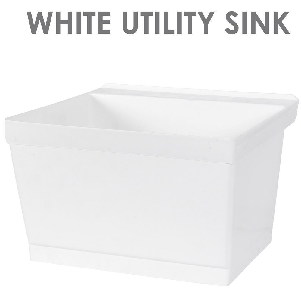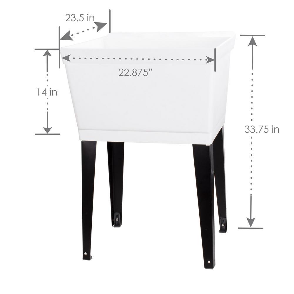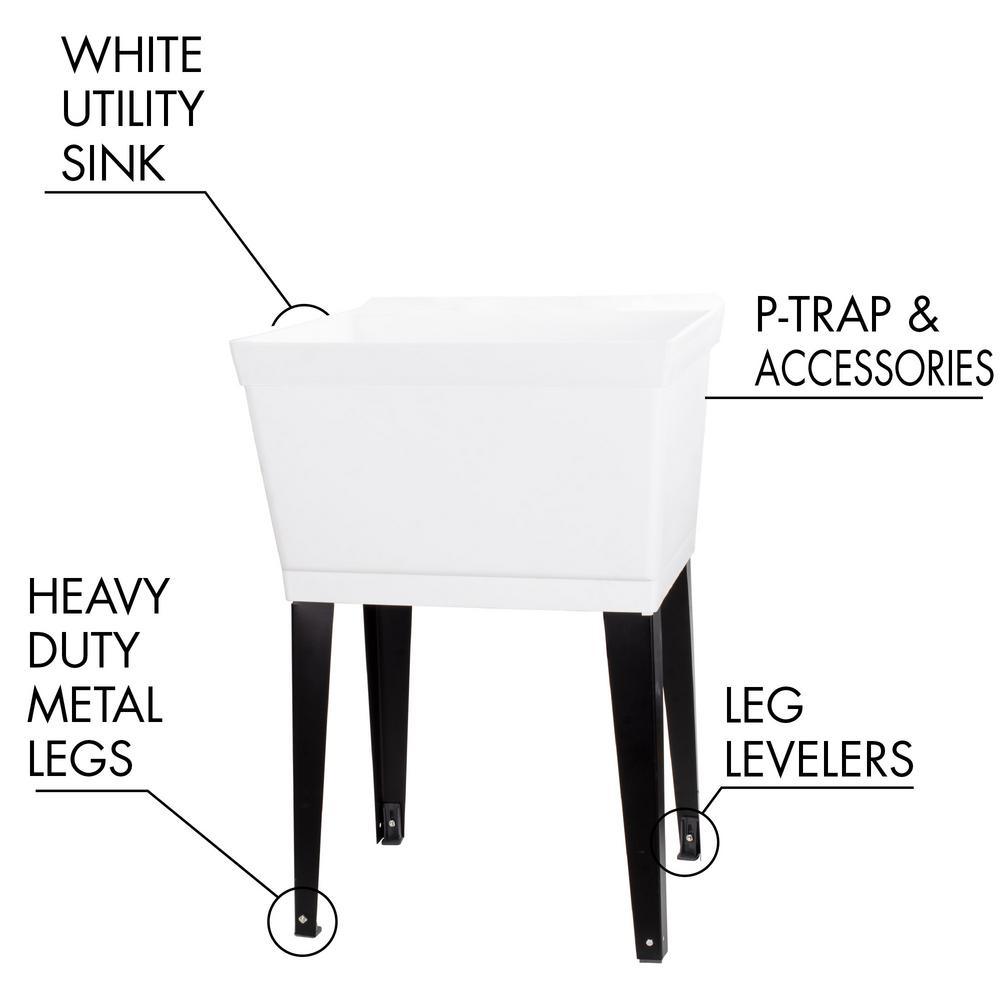 Our classic white Utility-Sink laundry tub. This 6502 series laundry tub set comes with a white tub, black metal legs, drain plug, two 20 in. supply lines, p-trap, floor levelers, hardware and installation instructions. Injected molded polypropylene, stain-resistant and durable this is the perfect tub for those who already have a faucet. 1-year limited warranty.
