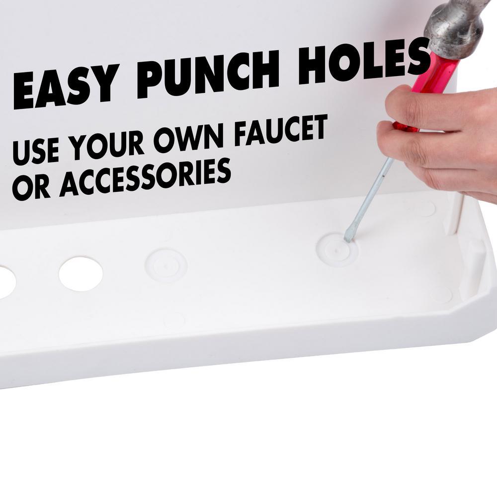 Additional outer pilot holes can accommodate side sprayers and soap dispensers