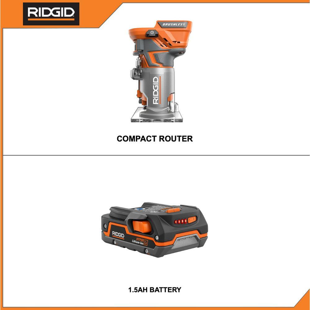 RIDGID introduces the 18-Volt Cordless Brushless 1/4 in. Compact Router with 1.5 Ah Lithium-Ion Battery. Cut up to 400 ft. of laminate per 5.0 Ah Battery charge (not included). Brushless Motor Technology delivers more runtime and a longer motor life. Combine the brushless motor with the extended runtime and get corded-like performance. Register this tool within 90 days of purchase and get FREE Parts. FREE Service. FOR LIFE. The 18-Volt Cordless Brushless 1/4 in. Compact Router with Fixed Base and Tool Free Depth Adjustment includes an edge guide, a 1/4 in. bit, round and square bases, a wrench, a contractor's bag, and an operator's manual. The included 18-Volt 1.5 Ah Compact Lithium-Ion Battery is equipped with an on board fuel gauge, increased temperature range for powering tools and improved run time. The battery produces industry leading performance in run time, recharges and extreme weather performance. Backed by the RIDGID 3-Year Manufacturer's Warranty, the 18-Volt 1.5 Ah Compact Lithium-Ion Battery includes an operator's manual. Charger not included.