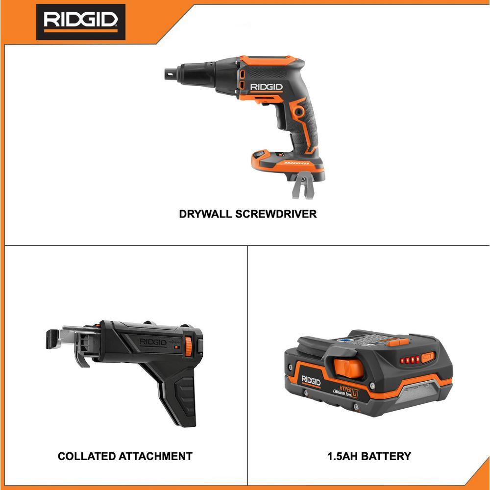 RIDGID introduces the 18-Volt Cordless Brushless Drywall Screwdriver with Collated Attachment with 1.5 Ah Lithium-Ion Battery. This tool offers 2-in-1 functionality, both drywall nose cone and collated attachment, to help tackle a variety of applications. With registration, this kit is backed by the Industry's Only Lifetime Service Agreement. The Brushless Drywall Screw Gun includes a collated attachment, a drywall nose cone, a bag and an operator's manual. The included 18-Volt 1.5 Ah Compact Lithium-Ion Battery is equipped with an on board fuel gauge, increased temperature range for powering tools and improved run time. The battery produces industry leading performance in run time, recharges and extreme weather performance. Backed by the RIDGID 3-Year Manufacturer's Warranty, the 18-Volt 1.5 Ah Compact Lithium-Ion Battery includes an operator's manual. Charger not included.
