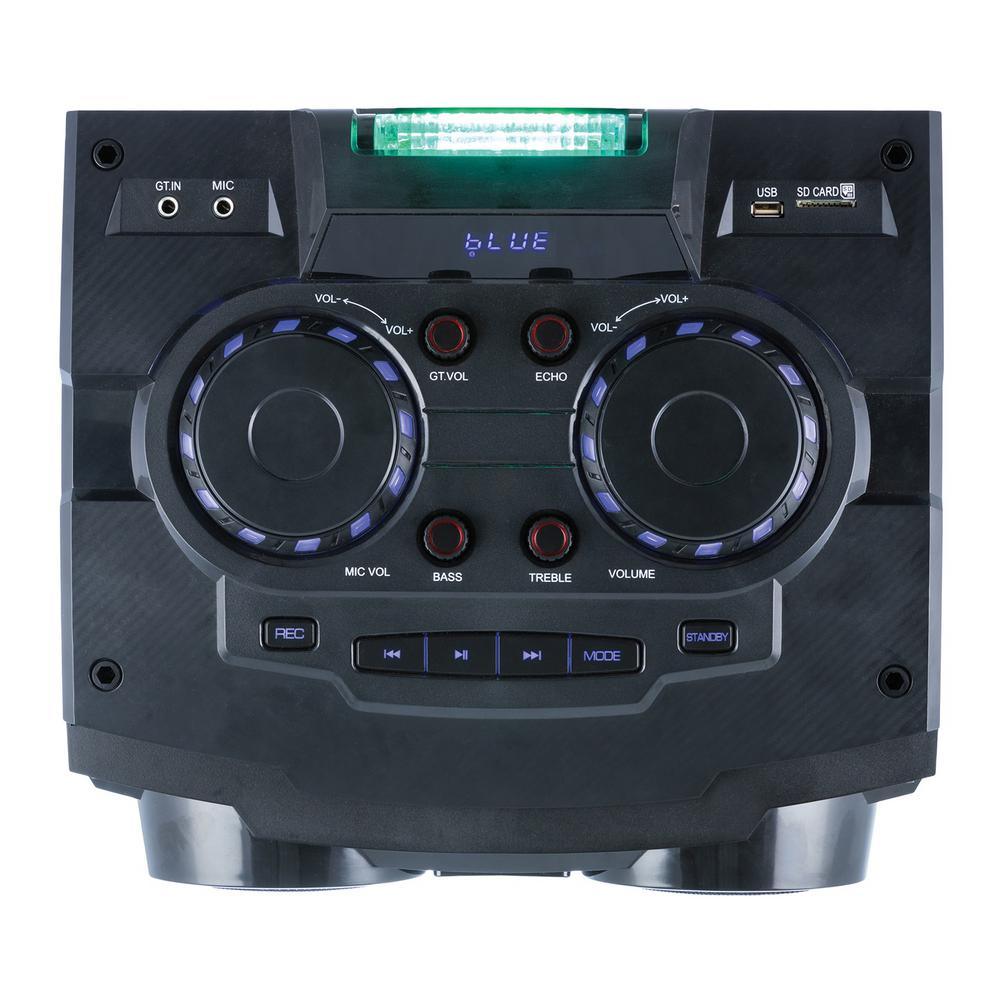 • Microphone/guitar input with volume, bass, treble and EQ controls