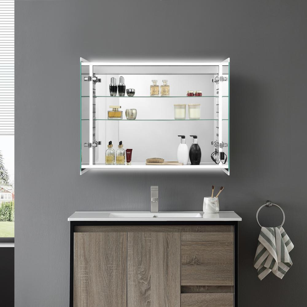 Elegant minimalism meets state-of-the art design with the Neva 30 in. x 24 inch landscape medicine cabinet by OVE Decors. Its durable all aluminum construction, fully mirrored double doors plus interior, soft-close hardware and handy adjustable height glass shelves pair with a striking integrated LED lighting surround. Enjoy bright, shadow less light that recreates the flattering qualities of natural daylight, with intensity easily controlled by a discreet smooth dimmer touch sensor.