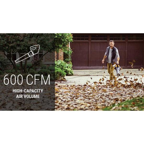 • Wide strong stream of air, 600 CFM (cubic feet per minute) come streaming out of the wide-mouth tube, that's high-capacity air volume so you clear your property with less passes back and fort