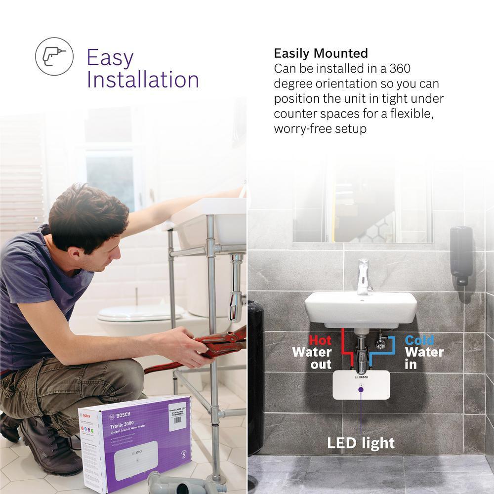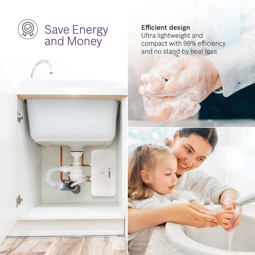 The Bosch 9 kW tankless water heater is a point-of-use water heater that helps eliminate long waits for hot water. Ideal for isolated sink locations in a home, office, warehouse or service station. A copper heat exchanger, 98% efficiency and the ability to heat only the water you use mean that you save water, energy and money. Units are compact and can be installed in any direction for flexible installation configurations.