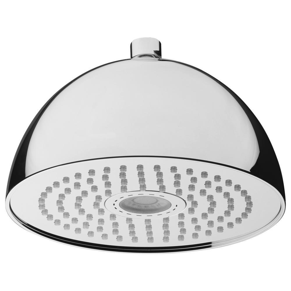 This modern shower head uses innovative technology to create an immersive shower experience. The dome-shaped shower head features over 7-1/2 in. of rain spray designed to enhance everyday bathing. Integrated LED lights illuminate the shower overhead, alternating from bright white to a rainbow of chromatic hues. State-of-the-art technology is secondary to the rain shower head's minimalist design that complements classic and contemporary bathrooms alike.