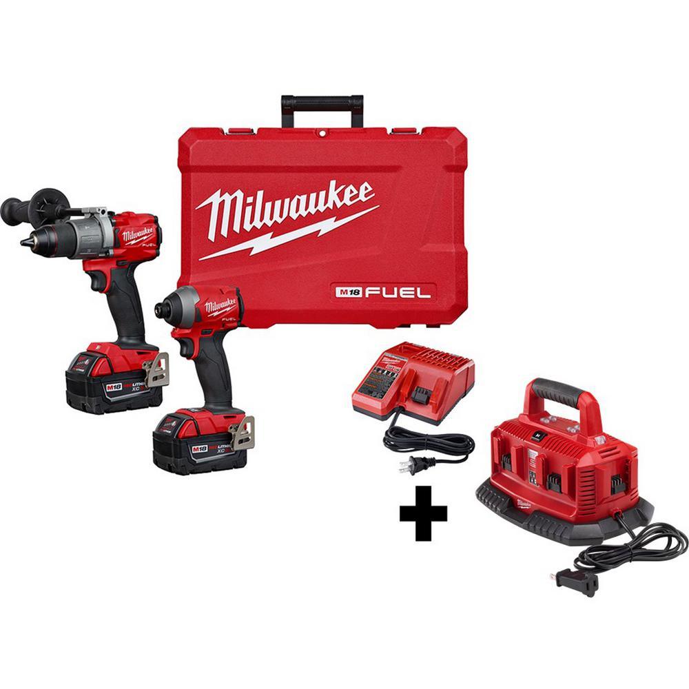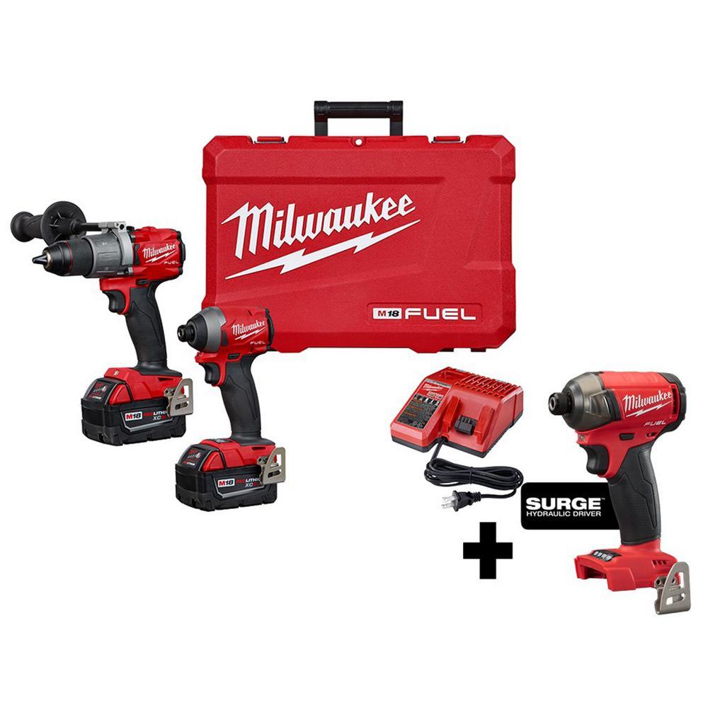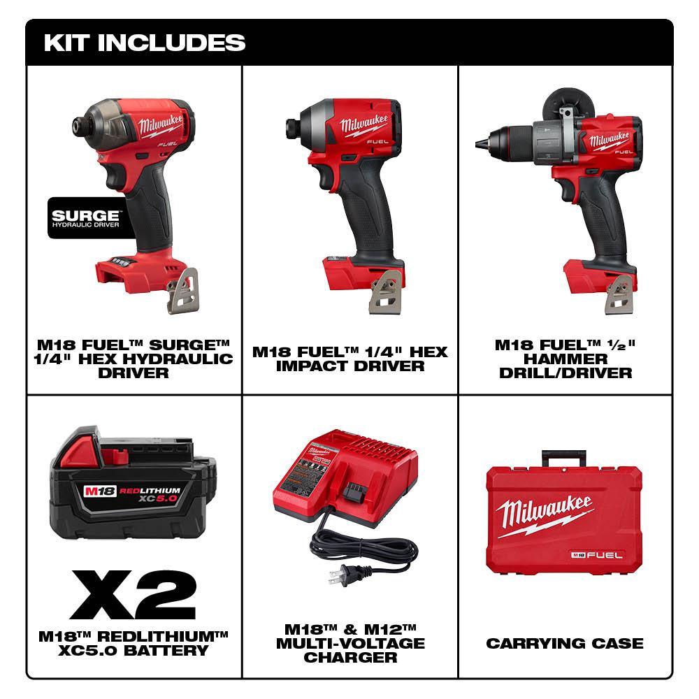 • Includes: 1 M18 FUEL 1/2 in. hammer drill (2804-20), 1 M18 FUEL 1/4 in. hex impact driver (2853-20), 2 M18 REDLITHIUM XC5.0 Battery, 1 M18 and M12 multi-voltage charger, 1 side handle, 2 belt clip, 2 bit holder, 1 carrying case, one 2760-20 M18 FUEL SURGE impact driver