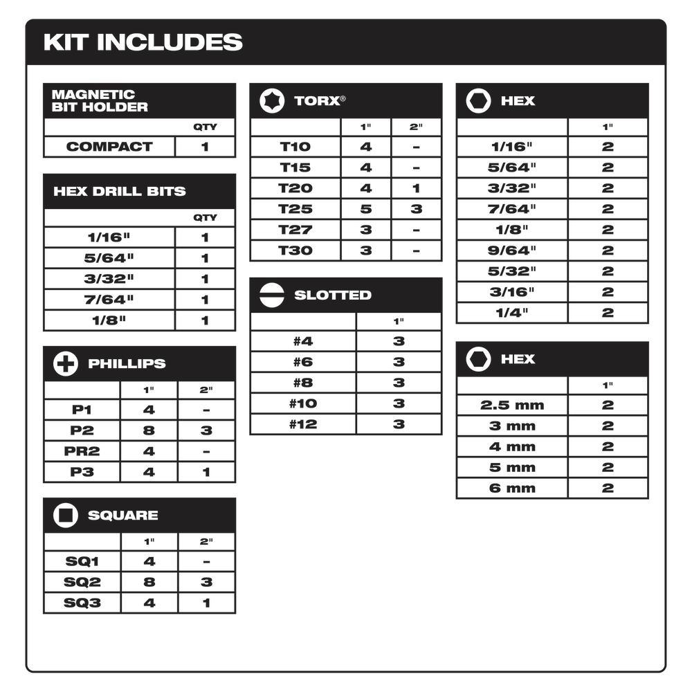 • Also Includes one additional 48-32-4496-120-pieces SHOCKWAVE D&D kit equals to 1 in. P1(4), 1 in. P2(8), 1 in. P2R (4), 1 in. P3(4), 1 in. SQ1(4), 1 in. SQ2 (8), 1 in. SQ3(4), 1 in. T10(4), 1 in. T15(4), 1 in. T20(4), 1 in. T25 (5), 1 in. T27(3), 1 in. T30(3), 1 in. SL7/64 in. (#3-4) #4(3), 1 in. SL1/8 in. (#4-5) #6(3), 1 in. SL3/16 in. (#6-8) #8(3), 1 in. SL1/4 in. (#8-10) #10(3), 1 in. SL9/32 in. (#10-12) #12(3), 1 in. hex 1/16 in. two, 1 in. hex 5/64 in. two, 1 in. hex 3/32 in. two, 1 in. hex 7/64 in. two, 1 in. hex 1/8 in. two, 1 in. hex 9/64 in. two, 1 in. hex 5/32 in. two, 1 in. hex 3/16 in. two, 1 in. hex 1/4 in. two, 1 in. hex 2.5 mm two, 1 in. hex 3 mm two, 1 in. hex 4 mm two, 1 in. hex 5 mm two, 1 in. hex 6 mm two, 2 in. P2(3), 2 in. P3one, 2 in. SQ2(3), 2 in. SQ3one, 2 in. T20, one, 2 in. T25 (3), compact (2.36 in.) bit holder one, 1/16 in. TiN SHOCKWAVE (1), 5/64 in. TiN SHOCKWAVE (1), 3/32 in. TiN SHOCKWAVE (1), 7/64 in. TiN SHOCKWAVE (1), 1/8 in. TiN SHOCKWAVE (1)