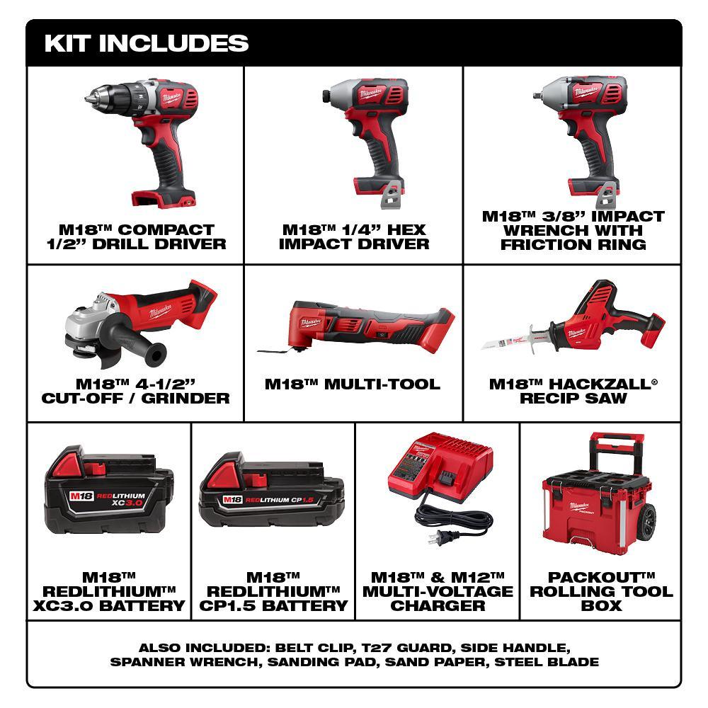 The Milwaukee M18 6-Piece Combo Kit with PACKOUT features an M18 1/2 in. Drill Driver, the most compact in its class to access the tightest work spaces while delivering users 500 in./lbs. of torque and up to 1,800 RPM. The M18 1/4 in. Hex Impact Driver offers the best power to size ratio among like competitors with up to 2,750 RPM, 3,450 IPM and 1,500 in./lbs. of fastening torque for class-leading performance. The M18 3/8 in. Impact Wrench, delivering up to 2,450 RPM, 3,350 IPM and 167 ft./lbs. of fastening torque for class-leading performance. The M18 HACKZALL features a 1-handed design for superior control and versatility with the ability to perform fast cuts through a wide range of material such as wood, metal and PVC. The M18 4-1/in. Grinder is the only cordless option on the market that has the user-preferred paddle switch for comfortable operating in various positions. The M18 Multi-Tool cuts up 50% faster and delivers up to 2X more cuts per charge than the competitors. The included batteries, 1 M18 XC 3.0 Battery and 1 M18 CP 1.5 Battery deliver more runtime, power and speed to the power tools in this kit. Milwaukee 13-Piece Bi-Metal General-Purpose HOLE DOZER Hole Saw Kit is engineered for longer life and faster cutting performance and is the Most Durable Hole Saw. The kit comes with 13 hole saw blades in 9 sizes.