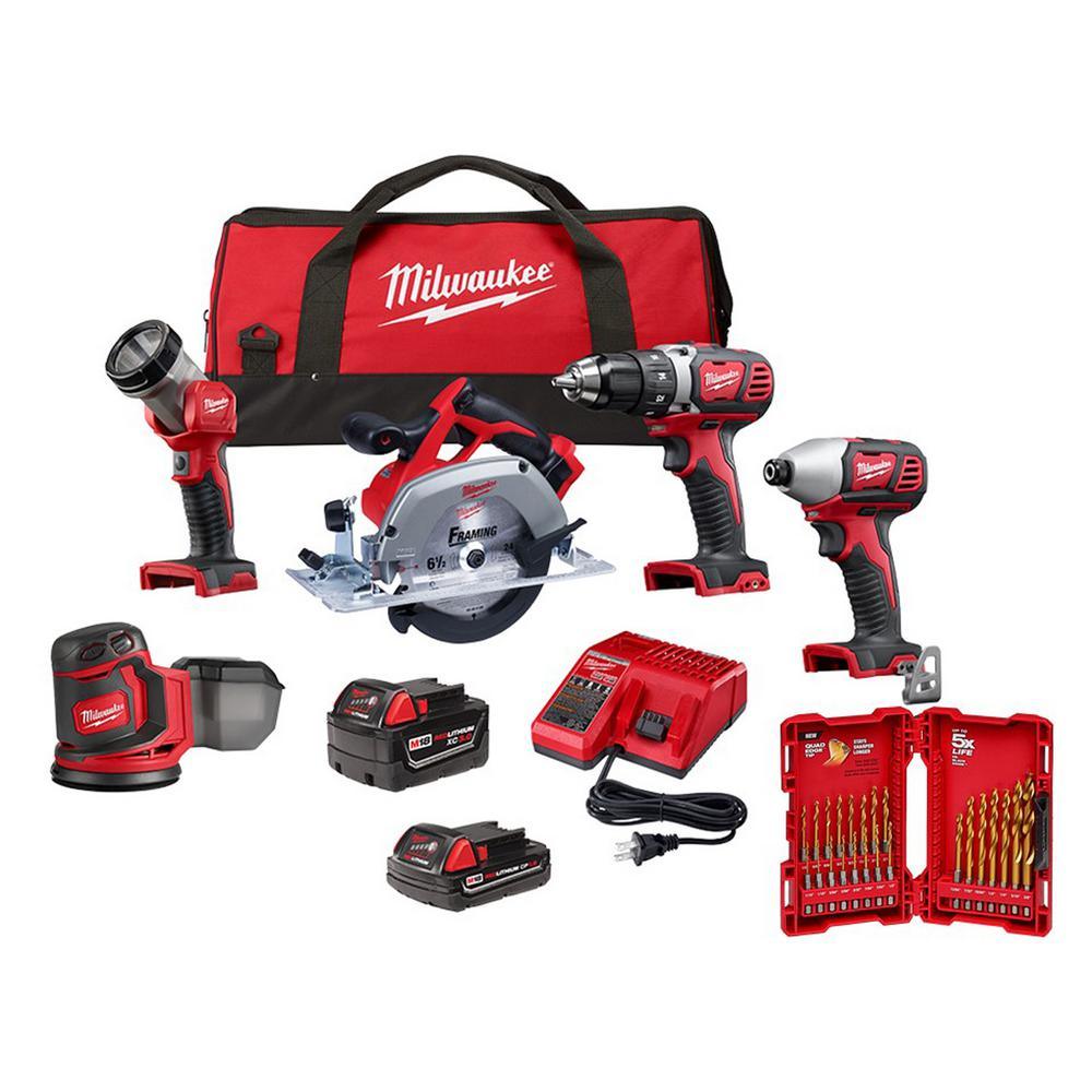 - Includes: one M18 drill/driver, one M18 impact driver, one M18 6-1/2 in. circular saw, one M18 random orbit sander, one M18 LED flashlight, one M18 REDLITHIUM XC 3.0 Ah battery, one M18 REDLITHIUM compact 1.5 Ah battery, one M18/M12 multi-voltage charger, 1-contractor bag and 1 SHOCKWAVE Impact Duty titanium drill bit set (23-piece)