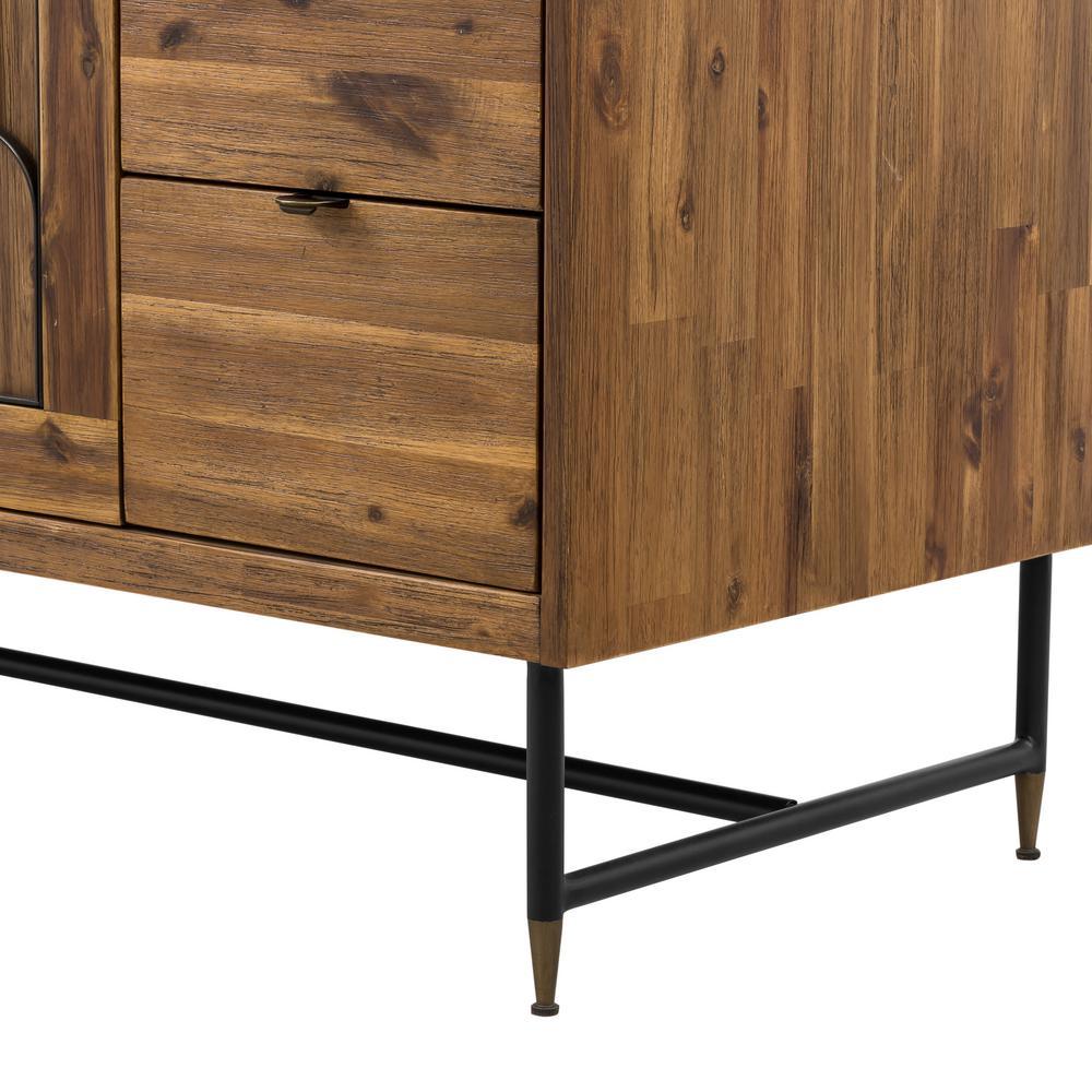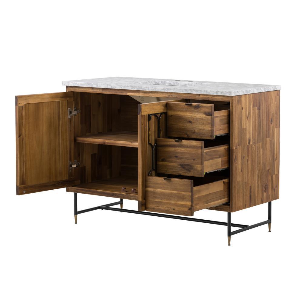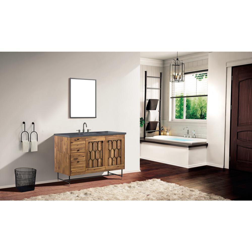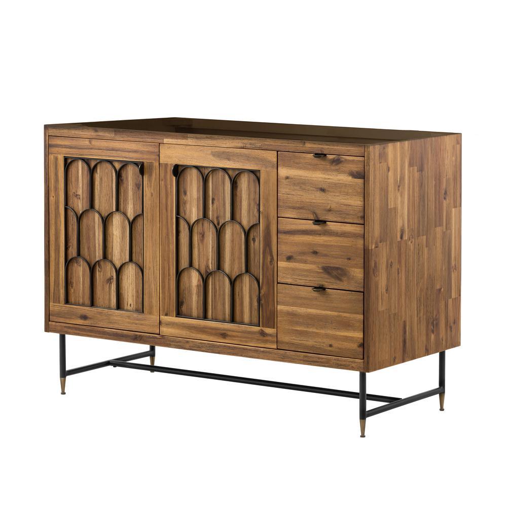 The Mariscal 48 in. wood finish vanity cabinet blends Art Deco design with Indonesian luxury. The priority of decorative elements is evident in the bold geometric inlays and signature metal legs. The frame is constructed from acacia, a tropical wood species valued for its beauty and durability. Soft-close hinges and glides and black metal hardware attest to this vanity's quality. Mariscal makes your bathroom magnificent.