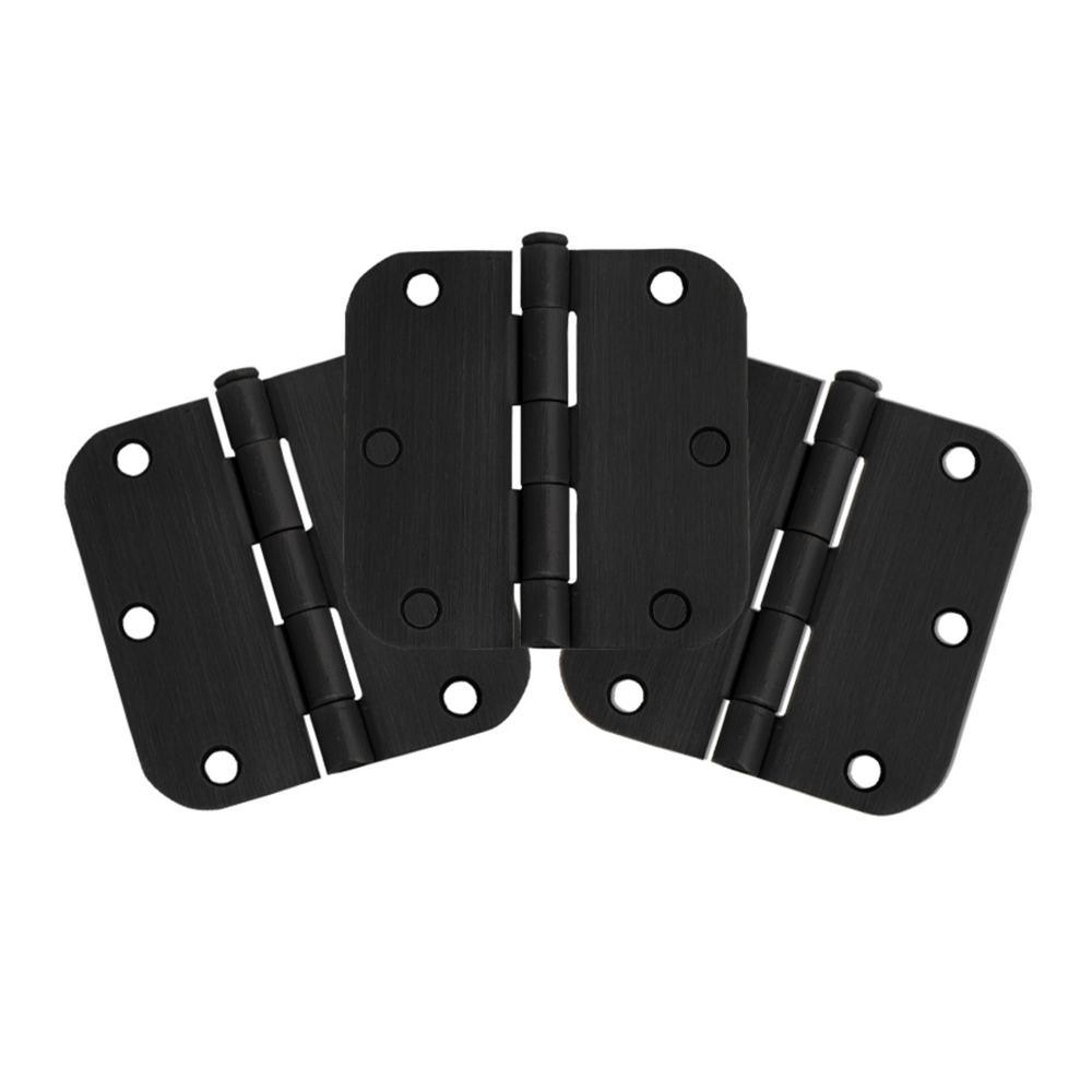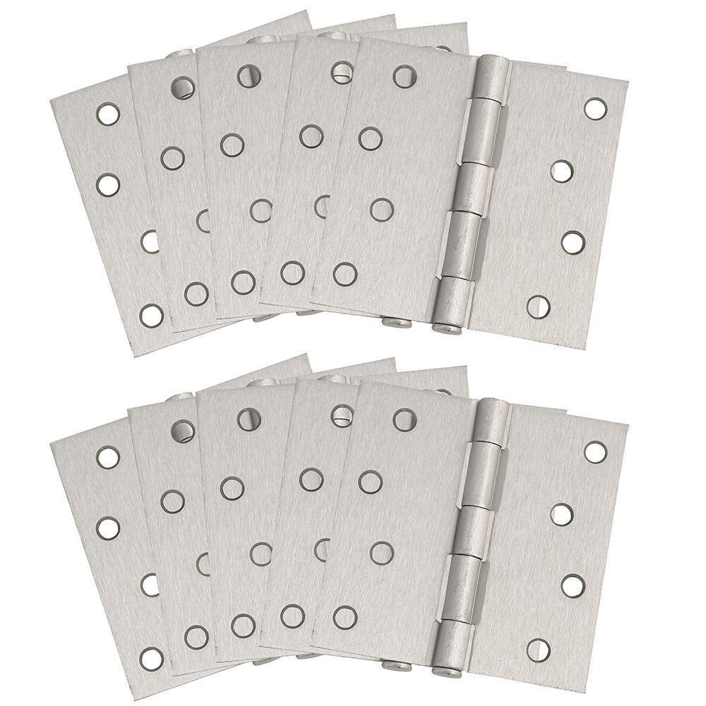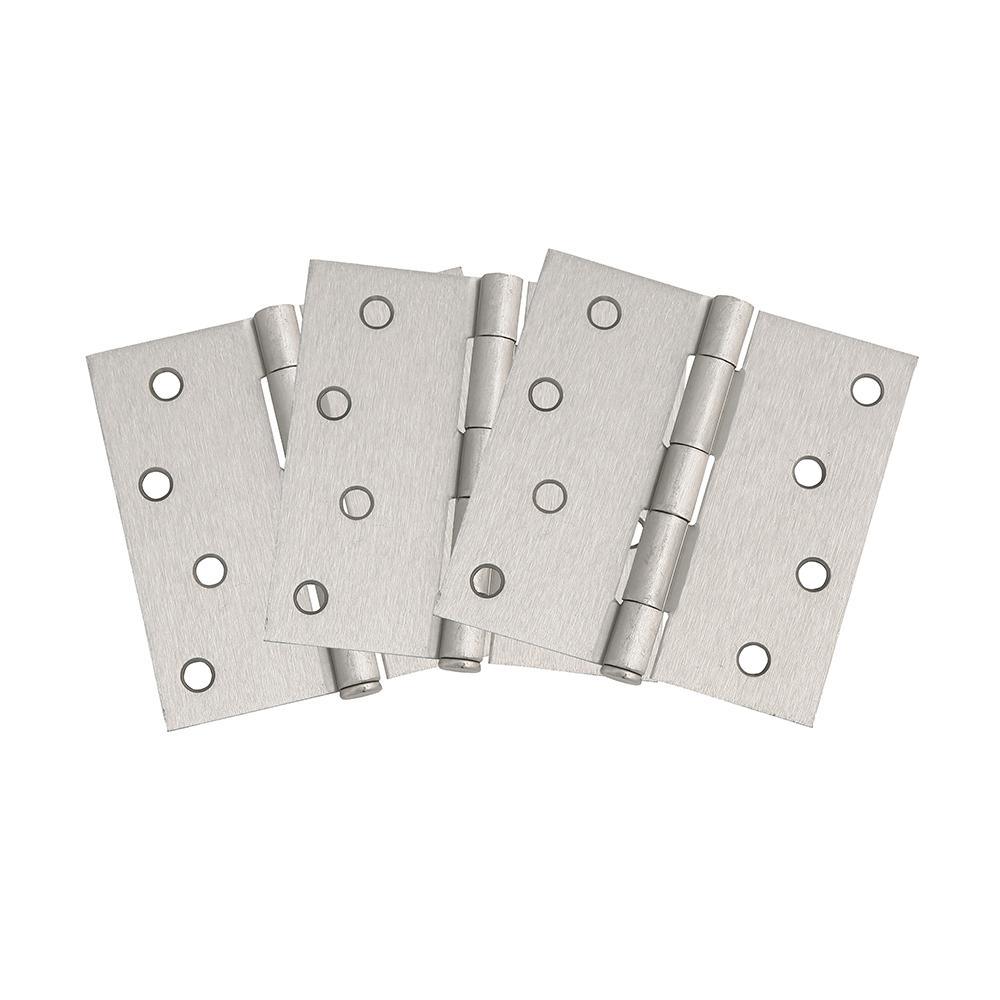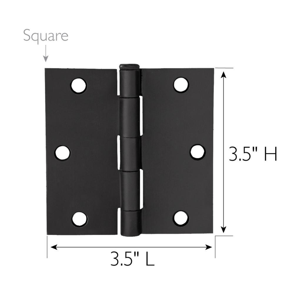 The Design House 188938 10-Pack Hinge 3.5 in. in Matte Black has a square corner, for use on residential duty wooden doors. These door hinges are made of steel with a staggered hole pattern. Each hinge has 6 holes and measures 3-1/2 in. x 3-1/2 in. x 7/16 in. These hinges do not have a removable pin, and screws are included.