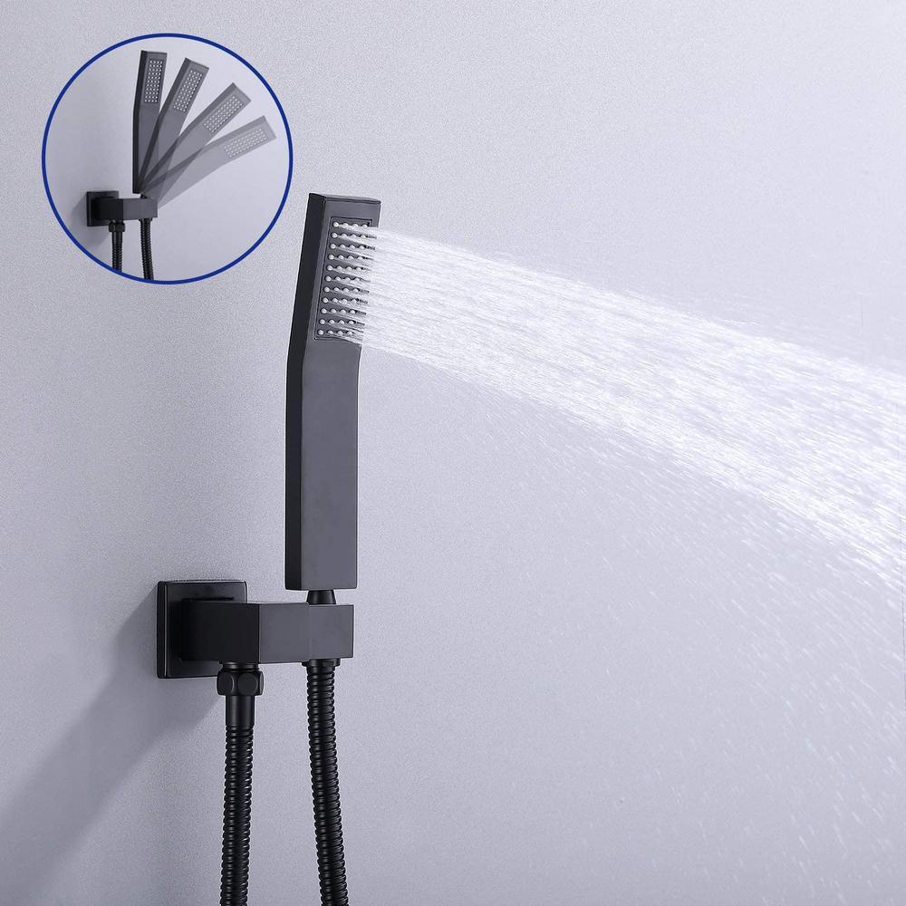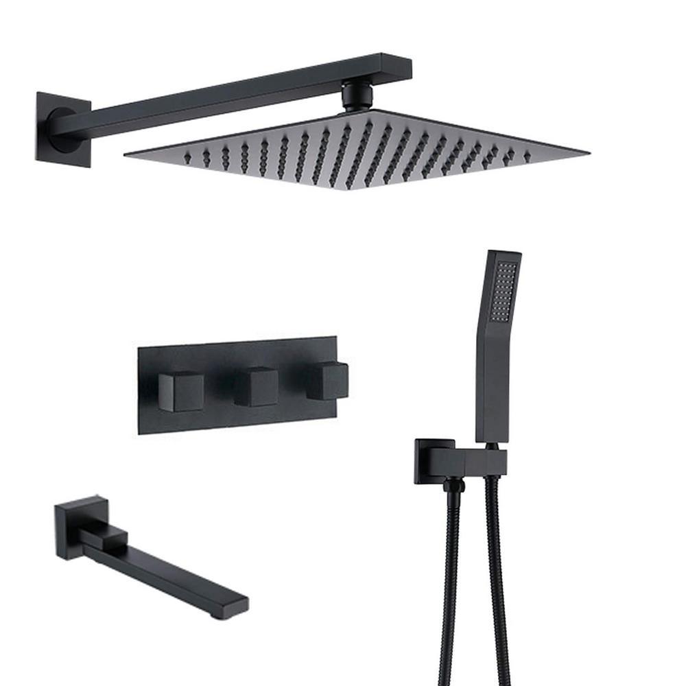 Complete your ultimate luxury matt black shower design with the striking outlet concealed thermostatic shower valve with shower handset. Three-way shower system with 10 in. Luxury rainfall shower head, handheld shower and tub spout faucet. The 10 in. square shower head offers a good shower experience. A hand shower with a flexible hose offers a large motion to aim at a specific place. Unique Design, bring the convenience for you when using the bathtub, you can quickly make water full your bathtub. This shower system comes with the pressure balance valve made from solid brass, boasting a sleek modern design and thermostatic safety technology to prevent scalding.