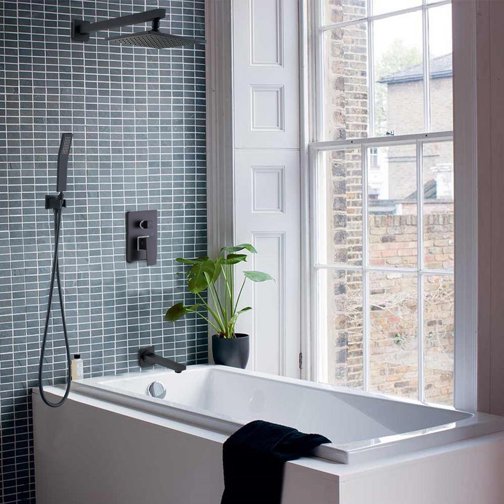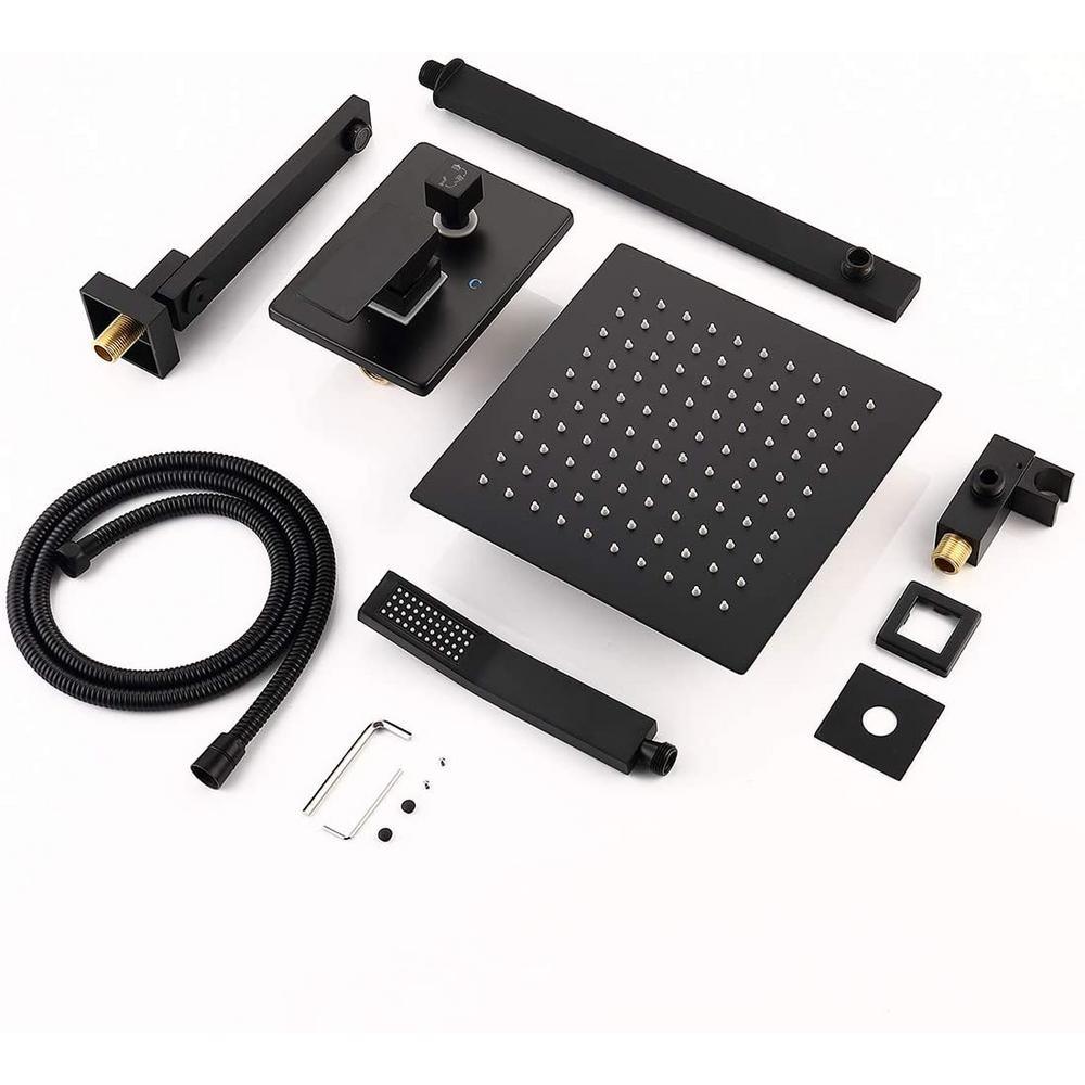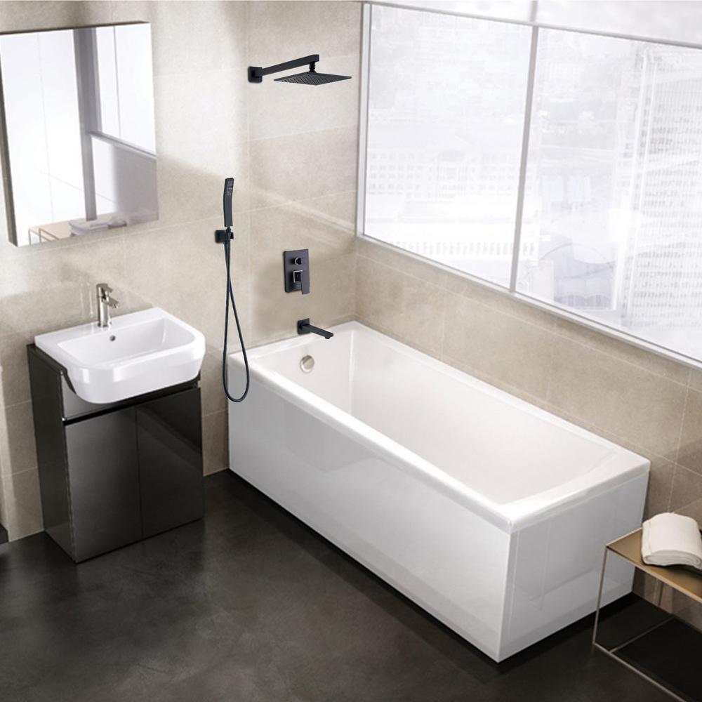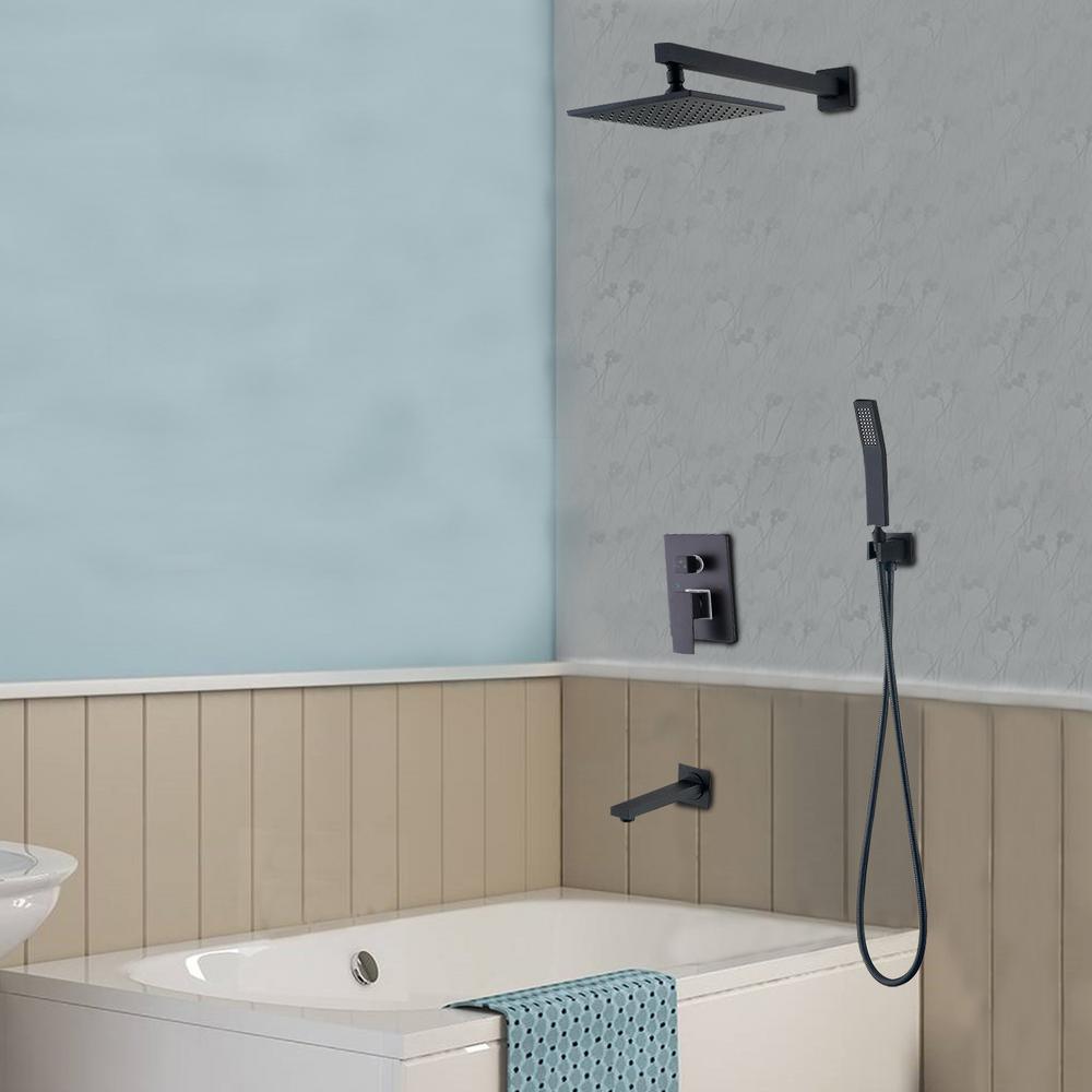 Complete your ultimate luxury matt black shower design with the striking outlet concealed thermostatic shower valve with shower handset. Three-way shower system with 10 in. Luxury rainfall shower head, handheld shower and tub spout faucet. The 10 in. square shower head offers a good shower experience. A hand shower with a flexible hose offers a large motion to aim at a specific place. Unique Design, bring the convenience for you when using the bathtub, you can quickly make water full your bathtub. This shower system comes with the pressure balance valve made from solid brass, boasting a sleek modern design and thermostatic safety technology to prevent scalding.