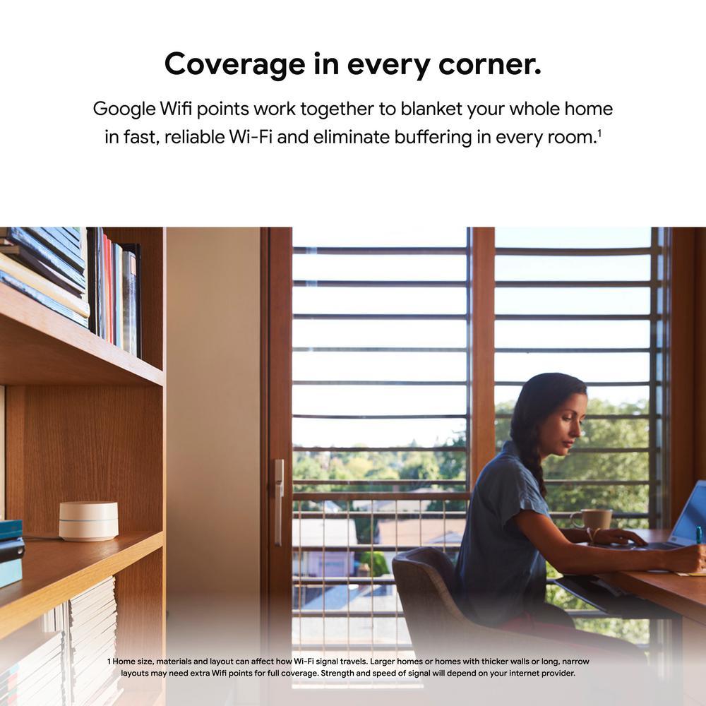 • Coverage in every corner. Google Wifi points work together to blanket your whole home in fast, reliable Wi-Fi and eliminate buffering in every room.1