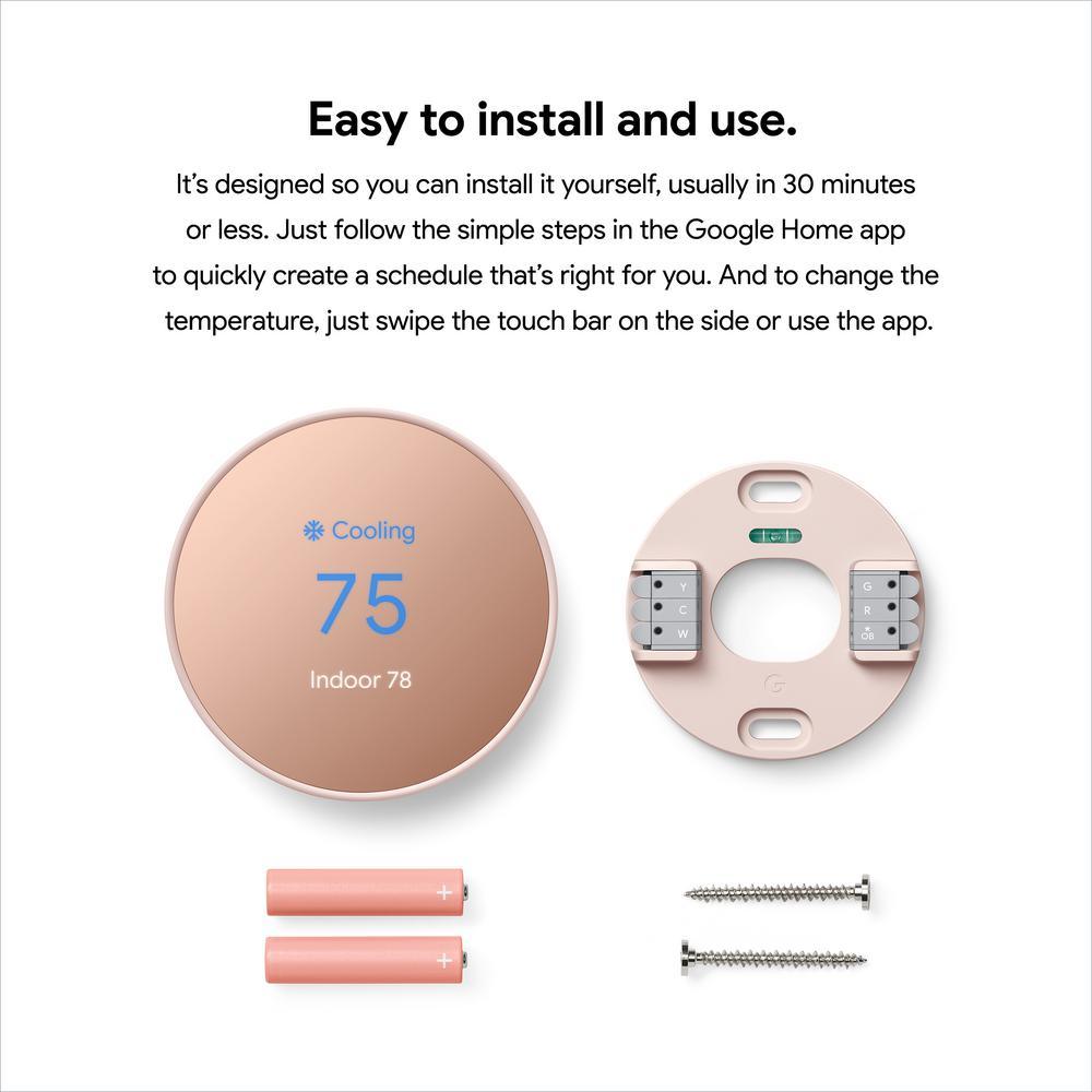 • Easy to install and use. It’s designed so you can install it yourself, usually in 30 minutes or less. Just follow the simple steps in the Google Home app to quickly create a schedule that’s right for you. And to change the temperature, just swipe the touch bar on the side or use the app.