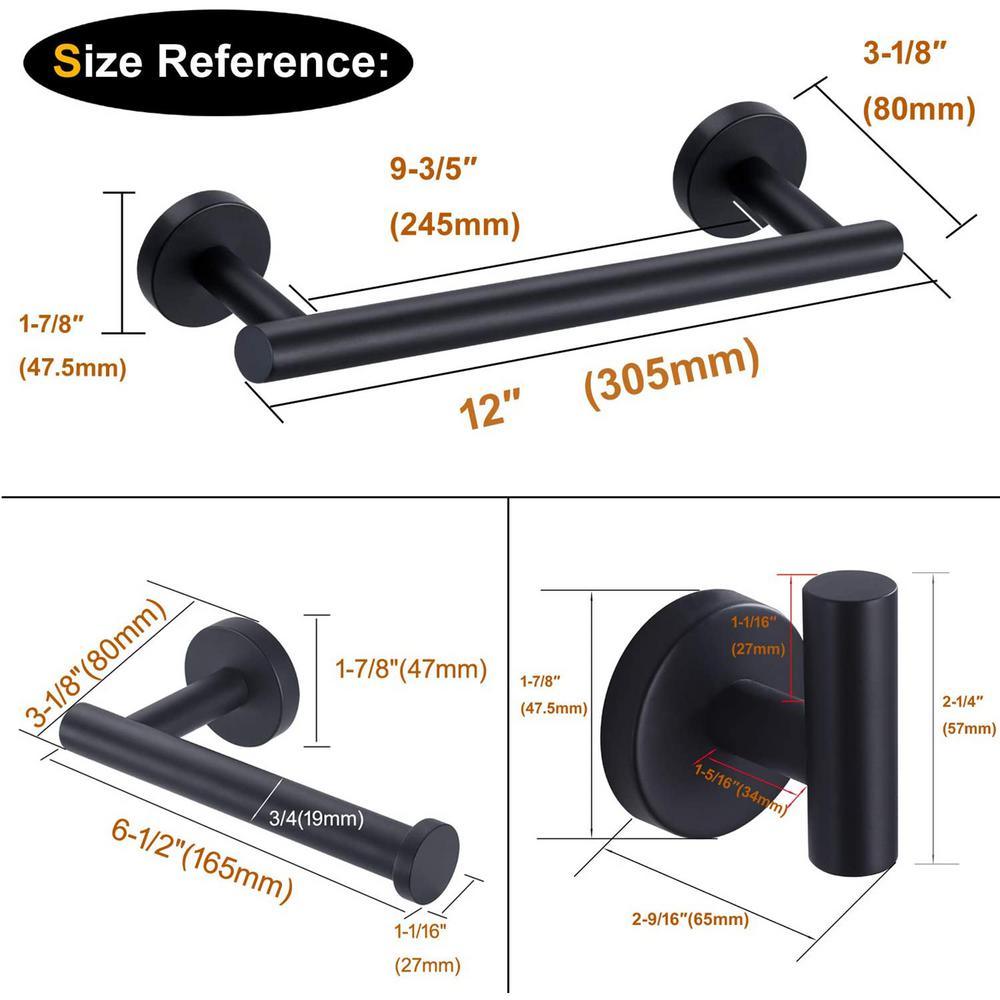 - Size reference a great way to supports door, wall or closet hanging things helps to optimizing your available space and displays visible items provides a tidy and commodious place to family towel bar: 12 in. (l) x 1.97 in. w) x 3.15 in. (d), toilet paper holder: 6.38 in. (l) x 1.97 in. (w) x 3.15 in. (d), robe hook:2.48 in. (l) x 1.97 in. (w) x 2.36 in. (d)