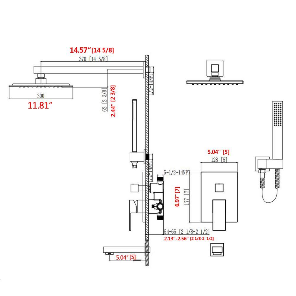 • Shower kit includes 12 inch (30cm*30 cm) rain shower head, 8 inch hand shower and 14.57 inch Shower Arm, valve trim, and elbow, shower holder.