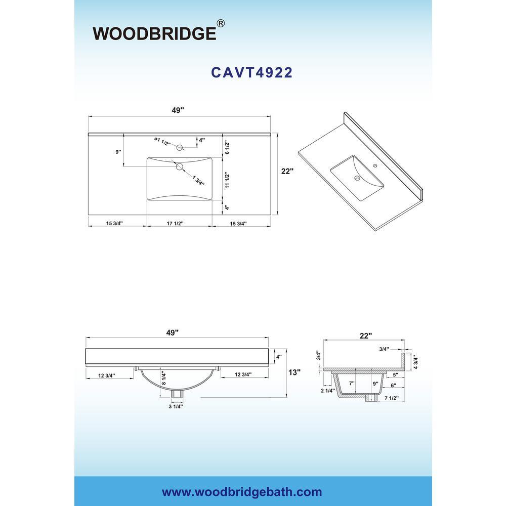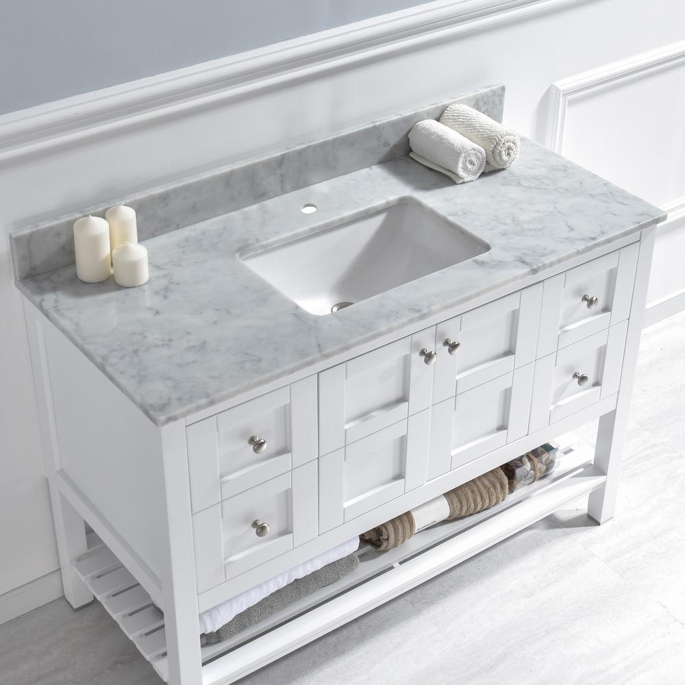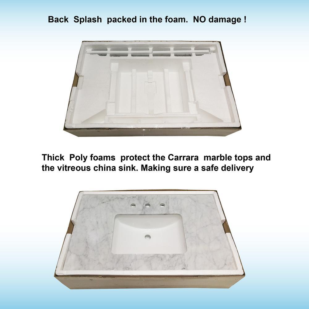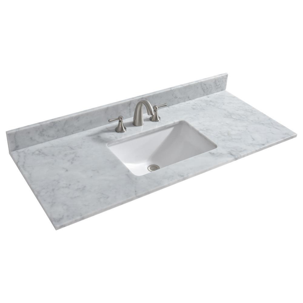Transform your bathroom with a beautiful marble vanity top with attached under-mount vitreous china sink. Perfect for quick and easy remodels. This marble top is easy to install and fits directly on top of any standard 48 in. vanity cabinet. An attached 4 ft. height backsplash will help protect your wall, and the back of your cabinet, against small splashes and spills. Marble is a natural material and slight variations in color may occur and are natural [dimensions]: Exterior Dimension: 49 in. wide x 22 in. deep. Fits Most Standard 48 in. W x 21 in. D vanity cabinet, single center faucet holes [Elegant and Stylish Top]: Warmly elegant and stylish, Carrara marble vanity top complement most Bathroom designs and coordinate with both light and dark cabinetry. High-end and classic natural stone top Pre-sealed and Polished for added protection. [Easy to Installation]: Top pre-drilled for single faucet, Assembled stylish rectangular white vitreous china under mount bowl with safety overflow hole, This top is perfect for quick and easy remodels. Obtain the beauty and durability of marble without hiring a professional [package included]: Vanity top with assembled rectangular under mount bowl , matching 4 in. high Backsplash. Besides, extremely solid package - very firm carton box with foam is used to transport top, making sure a safe delivery.