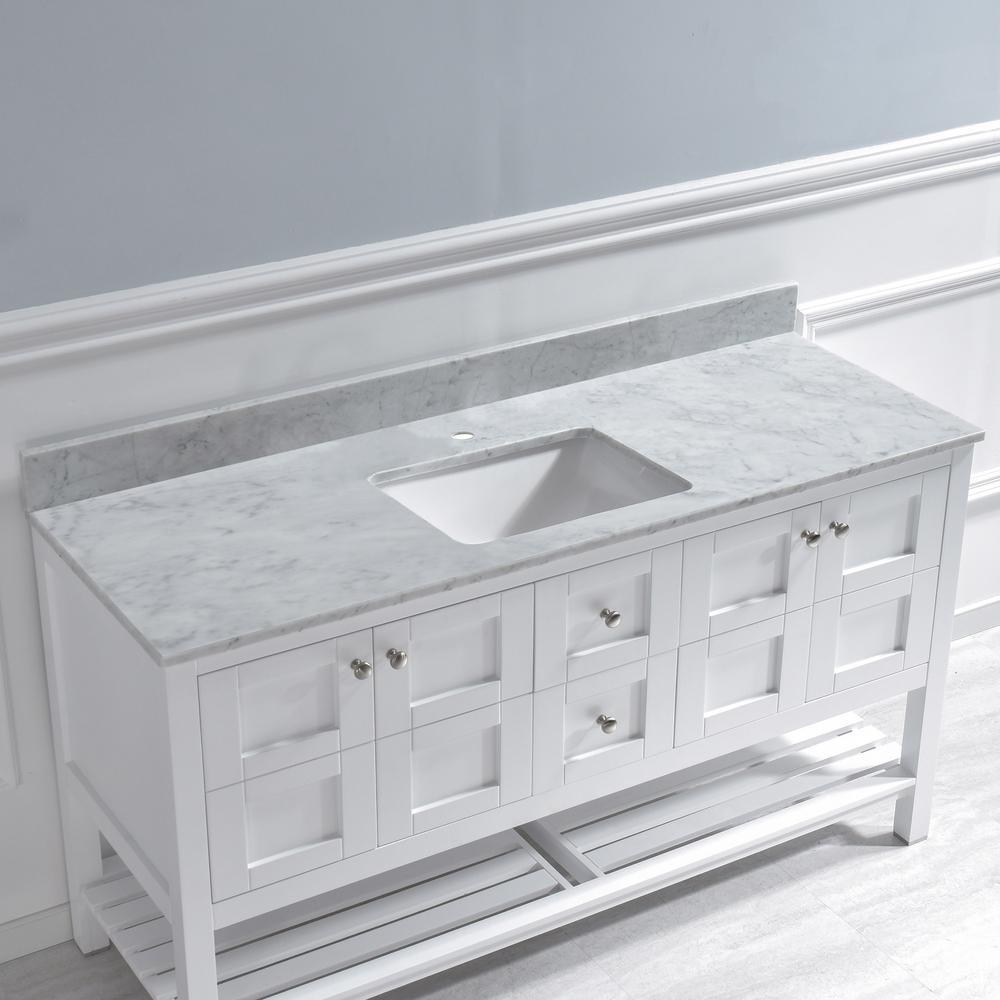 Transform your bathroom with a beautiful marble vanity top with attached under-mount vitreous china sink. Perfect for quick and easy remodels. This marble top is easy to install and fits directly on top of any standard 60 in. vanity cabinet. An attached 4 ft. height backsplash will help protect your wall, and the back of your cabinet, against small splashes and spills. Marble is a natural material and slight variations in color may occur and are natural. Dimensions: Exterior Dimension: 61 in. wide x 22 in. deep. Fits Most Standard 60 in. W x 21 in. D vanity cabinet, single center faucet holes Elegant and Stylish Top: Warmly elegant and stylish, Carrara marble vanity top complement most Bathroom designs and coordinate with both light and dark cabinetry. High-end and classic natural stone top Pre-sealed and Polished for added protection. Easy to Installation: Top pre-drilled for single faucet, Assembled stylish rectangular white vitreous china under mount bowl with safety overflow hole, This top is perfect for quick and easy remodels. Obtain the beauty and durability of marble without hiring a professional Package Included: Vanity top with assembled rectangular under mount bowl , matching 4 in. high Backsplash. Besides, extremely solid package - very firm carton box with foam is used to transport top, making sure a safe delivery.