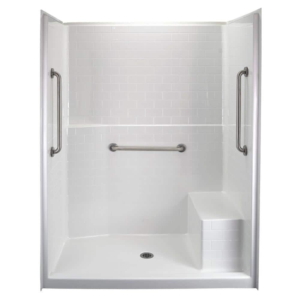 Elegant shower featuring Classic Subway tile with AcrylX applied acrylic finish with our robust warranty. Ergonomic features include low 3 in. threshold with 0.75 in. above the floor rough minimizes level change for easier entry and exit of shower, slip-resistant textured floor, tall and spacious molded in seating, and adaptable flat walls with built-in heavy-duty wood reinforcement in key locations to provide the ability to securely mount the 3 Stainless Steel grab bars included with this package. Available in White, Bone and Biscuit finishes