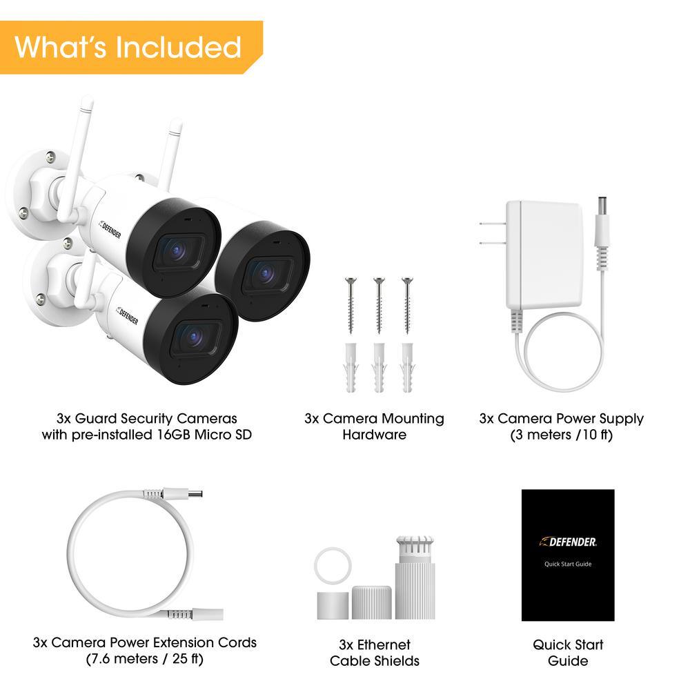 Keep an eye on your home even when you're away with this Guard Bullet Outdoor 2K(4MP) IP Wireless Security Camera by Defender. With features including double the resolution of an HD camera, remote viewing with instant alerts and audio recording, you can check on everything from deliveries to precipitation. The free Defender 24-7 app gives you instant access to your live feed and recorded footage. A wide angle lens gives you twice the coverage area of most standard cameras. Local recording to the included 16GB SD card (expandable up to 128GB) means your security footage saves directly to the card, so there are no storage or subscription fees.