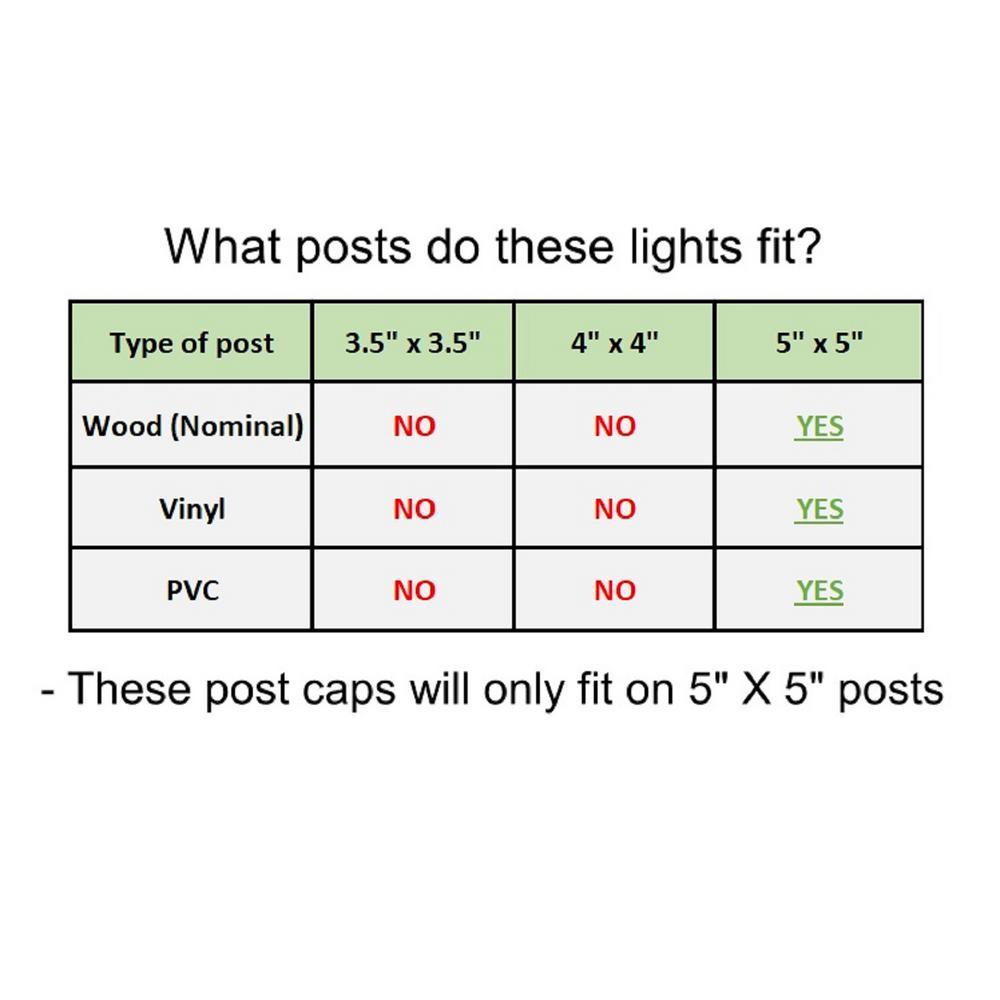 • Solar cap post lights will only fit base within dimension 5 in. x 5 in. posts