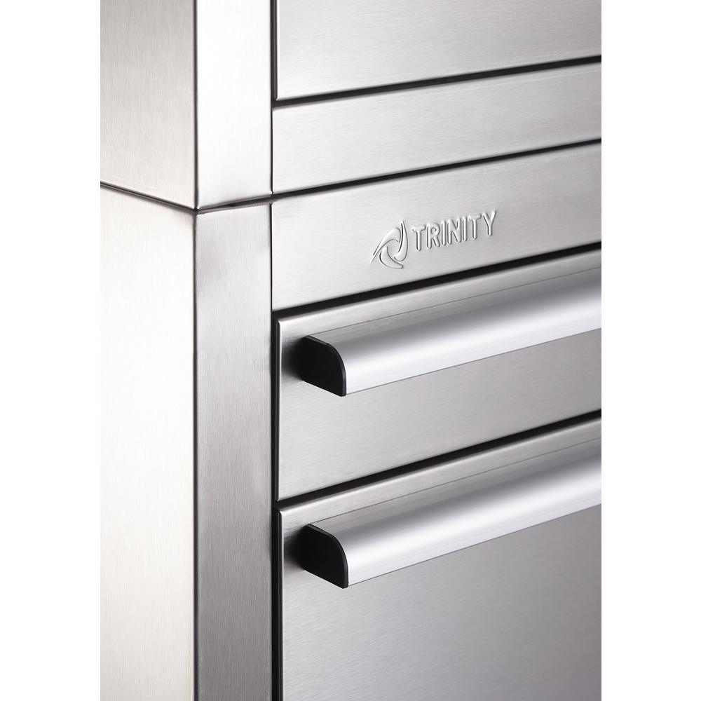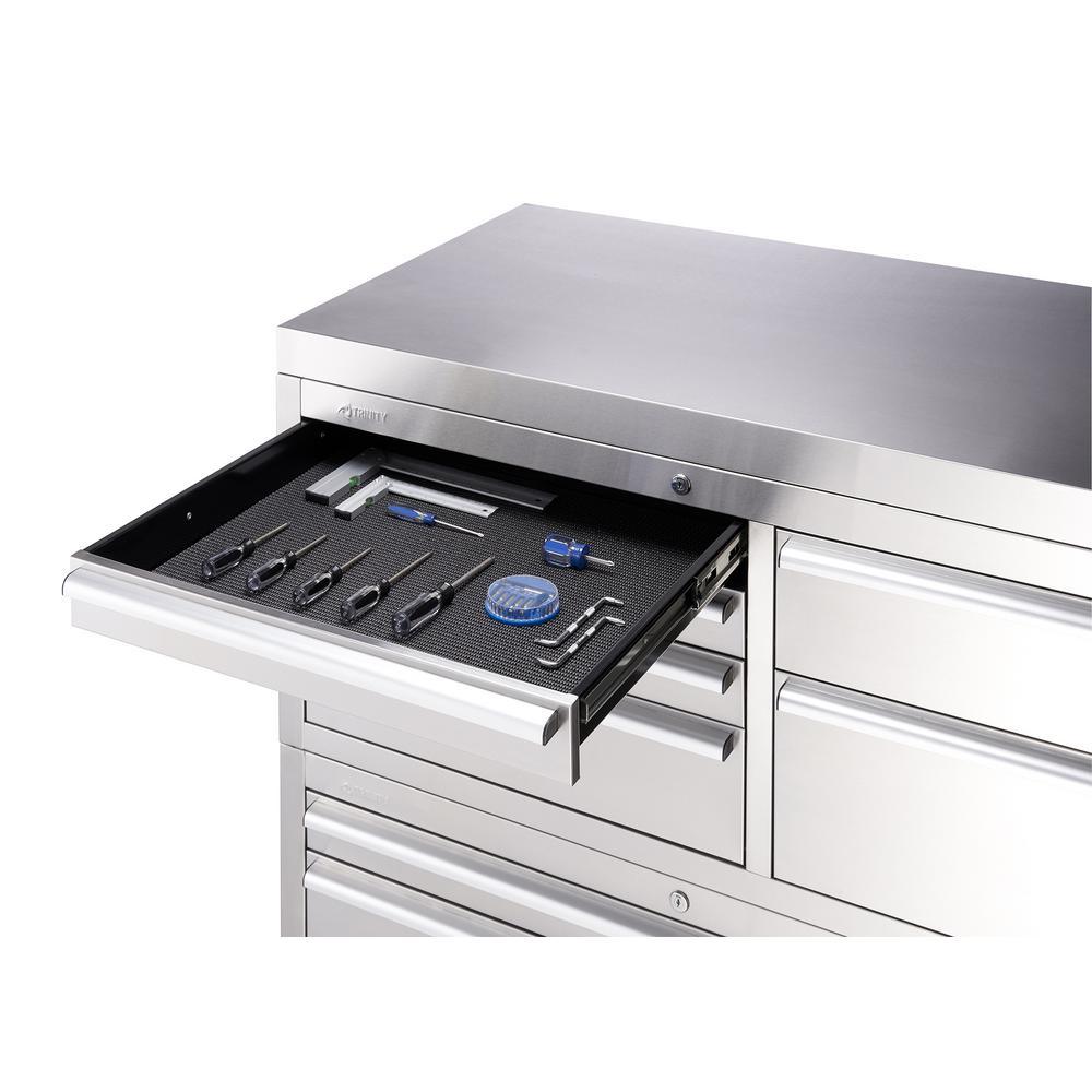 TRINITY's commercial-grade stainless steel 43 in. x 25 in. combo rolling tool chest is perfect for all your garage, workshop, or commerical facility storage needs. The 11-drawer layout provides enough space to organize hand tools, small power equipment, and everything in between. Each drawer is equipped with 100 lbs. ball bearing slides, except the bottom drawer which is equipped with 2-pairs of slides and can hold double the weight (200 lbs.). The heavy-duty 5 in. x 2 in. wheels provide easy maneuverability when loaded up (2,200 lbs. total weight capacity). Its high-end design and functionality not only make this tool chest a great value, but its size ensures room for all large and small tools.