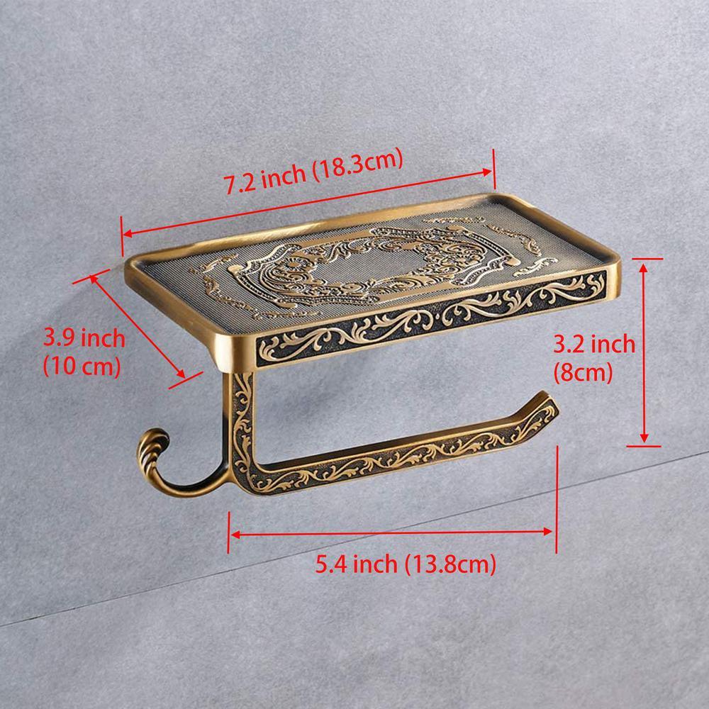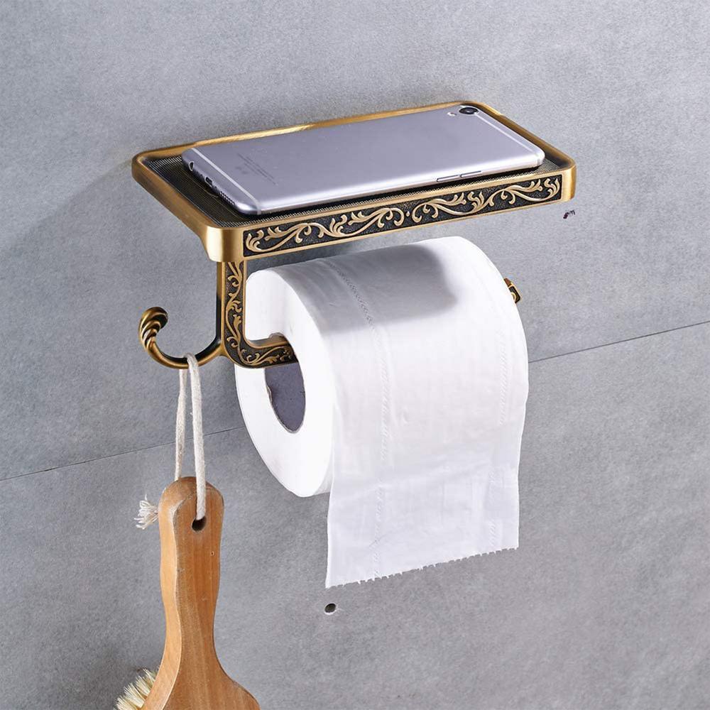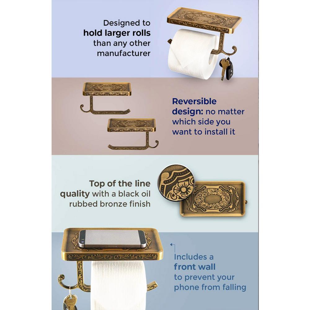 Reversible Bathroom Toilet Paper Holder with Phone Shelf and Hook, Vintage Decor Style (Bronze).The problem with most phone shelves is that the toilet paper holder can only be installed in one direction. We created a unique design that is reversible, which allows you the freedom to install it anywhere you like.Most competing products have a limited capacity for the size of toilet paper roll it can hold. Our design accommodates larger rolls which keep the paper from rubbing on the wall.