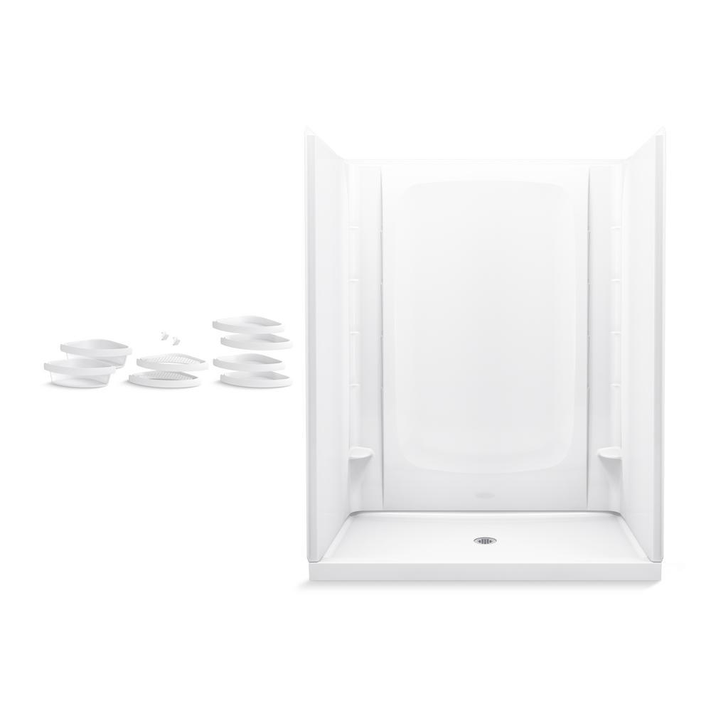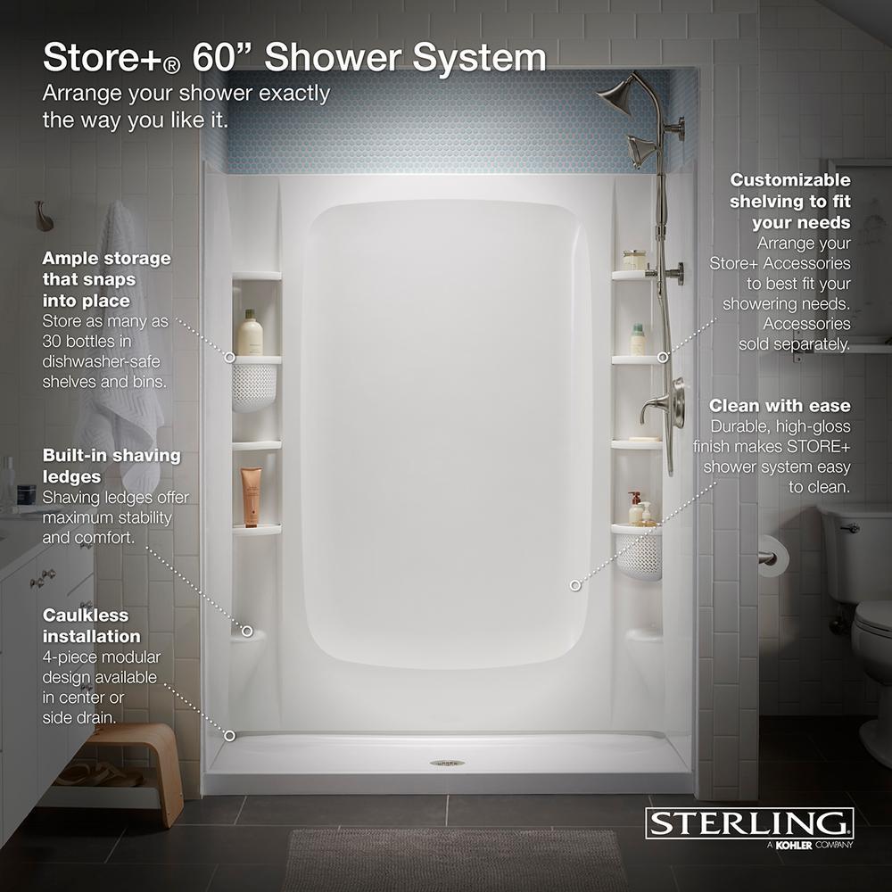 STORE+ 60 in. x 34 in. Single Threshold Center Drain Shower Base with Shower Walls and 10-Piece Accessory Kit in White