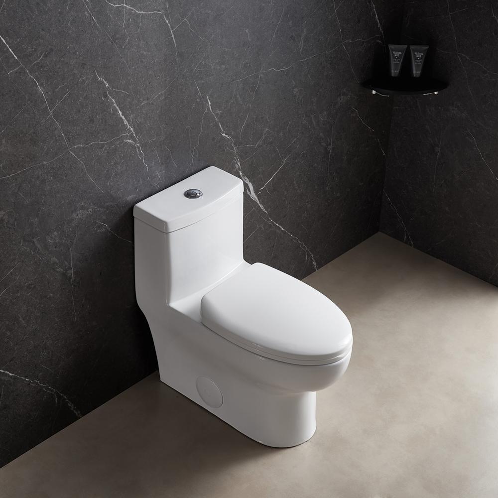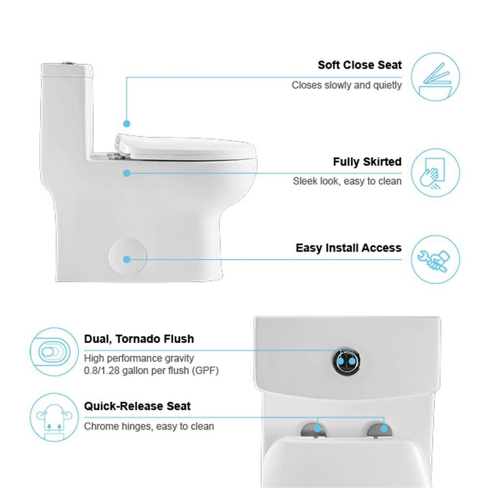 - Features a slim tank cover with a sleek skirted design, the close coupled toilet is visually appealing for most of us with its flush actuator at the top/side of the tank, with one time flush, this toilet will press all of the filled water and help reduce things like bacterial build up and staining on the tank surface, which offers everything you need for comfort and security in the bathroom