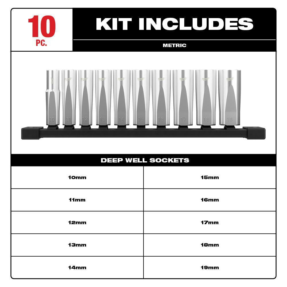 • Kit Includes: (1) 48-22-9405 3/8 in. Drive SAE Deep Well 6-Point Socket Set (10-Piece) AND (1) 48-22-9505 3/8 in. Drive METRIC Deep Well 6-Point Socket Set (10-Piece)