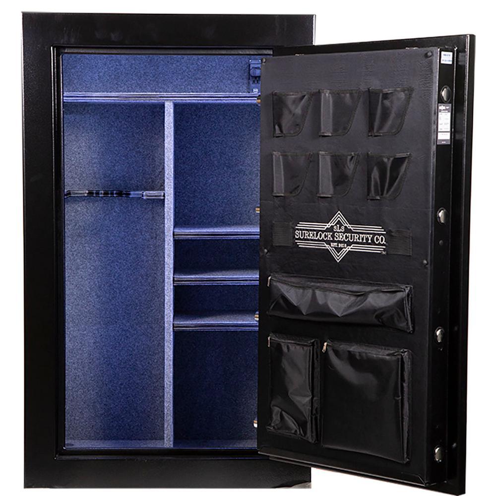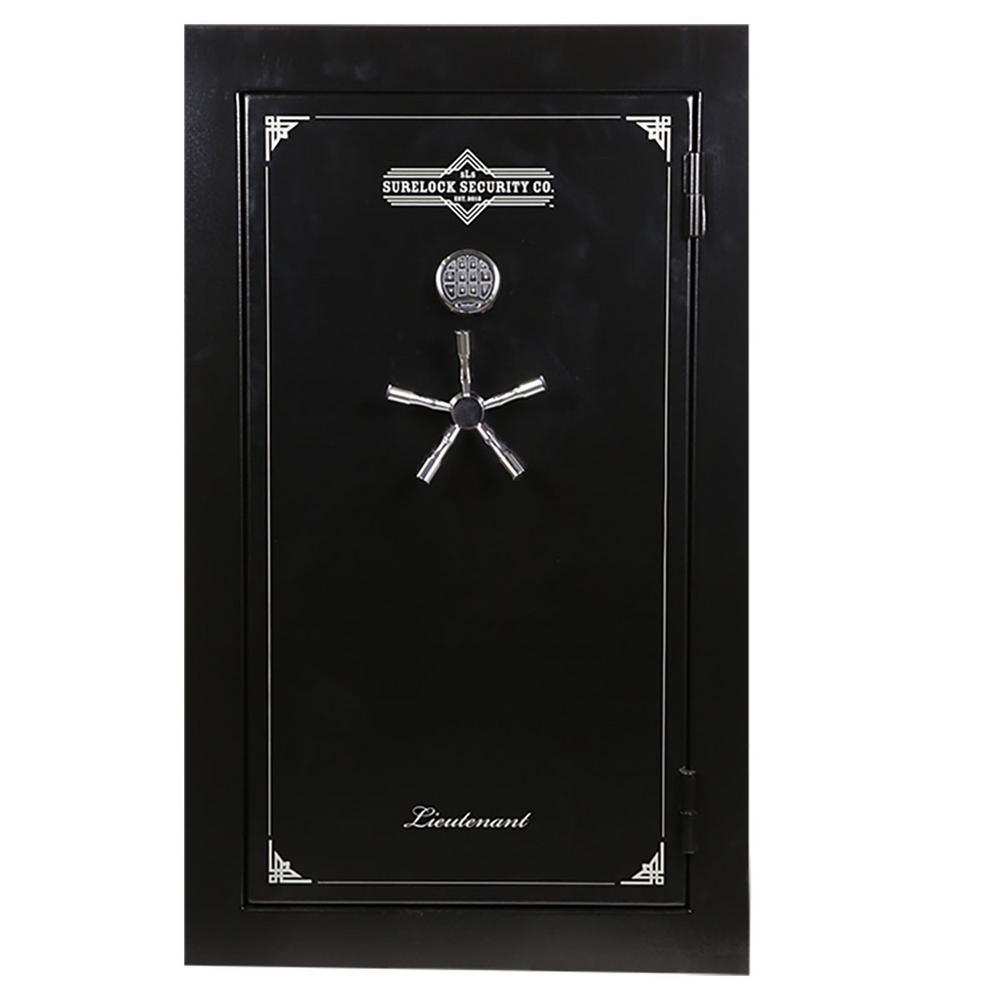 The Gen II Lieutenant 48 is a gun and home safe crafted for people who believe that size does matter. It will hold up to 48 long guns and is constructed of 12-Gauge steel with twelve, 1.5 in. locking bolts (8 active). for supreme organization, the adjustable interior includes 3-shelves and 2 gun racks, as well as an interior organizational door panel. Store keys, jewelry, passports and the like easily and conveniently in the door panel, that way you don't have to go dig them out of the back of the safe when you need them. Pistol pockets are also included in the door panel, for even more firearm storage space. The 60-minute fire rating (at 1400°) and Palusol seal provide excellent protection should a fire occur. Crisp and clean, a safe doesn't have to be an eye sore. Finished in a matte black, light gray interior and stunning 5 spoke chrome handle and lock, this big steel box has just the fight amount of finesse. The Gen II Lieutenant 48 is the perfect gun and home safe for the seasoned collector with a moderate/mid-sized collection or a growing family. Backed by SURELOCK Security's Lifetime Replacement Program - the Lieutenant Series Gun and Home Safe offers superior, dependable protection that safely secures all your firearms and cherished belongings.