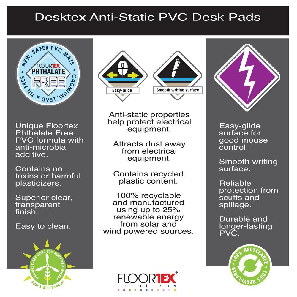 The Anti-Static PVC mat dissipates static electricity and attracts dust away from your equipment providing added protection. Use under your laptop or electrical equipment to reduce the harmful effects of static electricity. Constant movement around electrical devices, computers and medical equipment cause a build-up of static and dust that can damage the machines. Desk pads protect expensive desk surfaces from damage and they can save companies money in the long term, by reducing the need to update or fix damaged office furniture as often. All Polycarbonate and PVC desk pads in the Desktex range are fully recyclable and are manufactured in our facility which obtains 25% of its energy requirements from renewable sources. You can also use Desktex desk pads around the home. Proudly designed and manufactured in the UK.