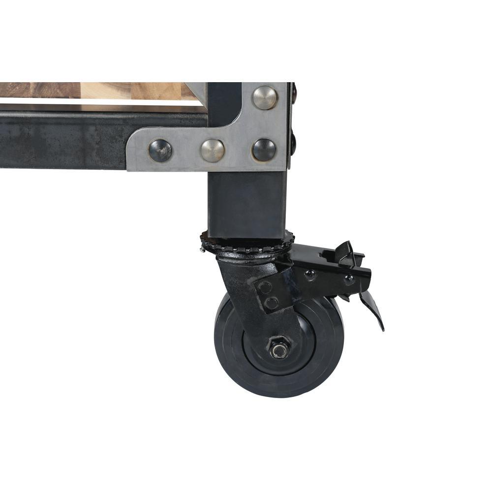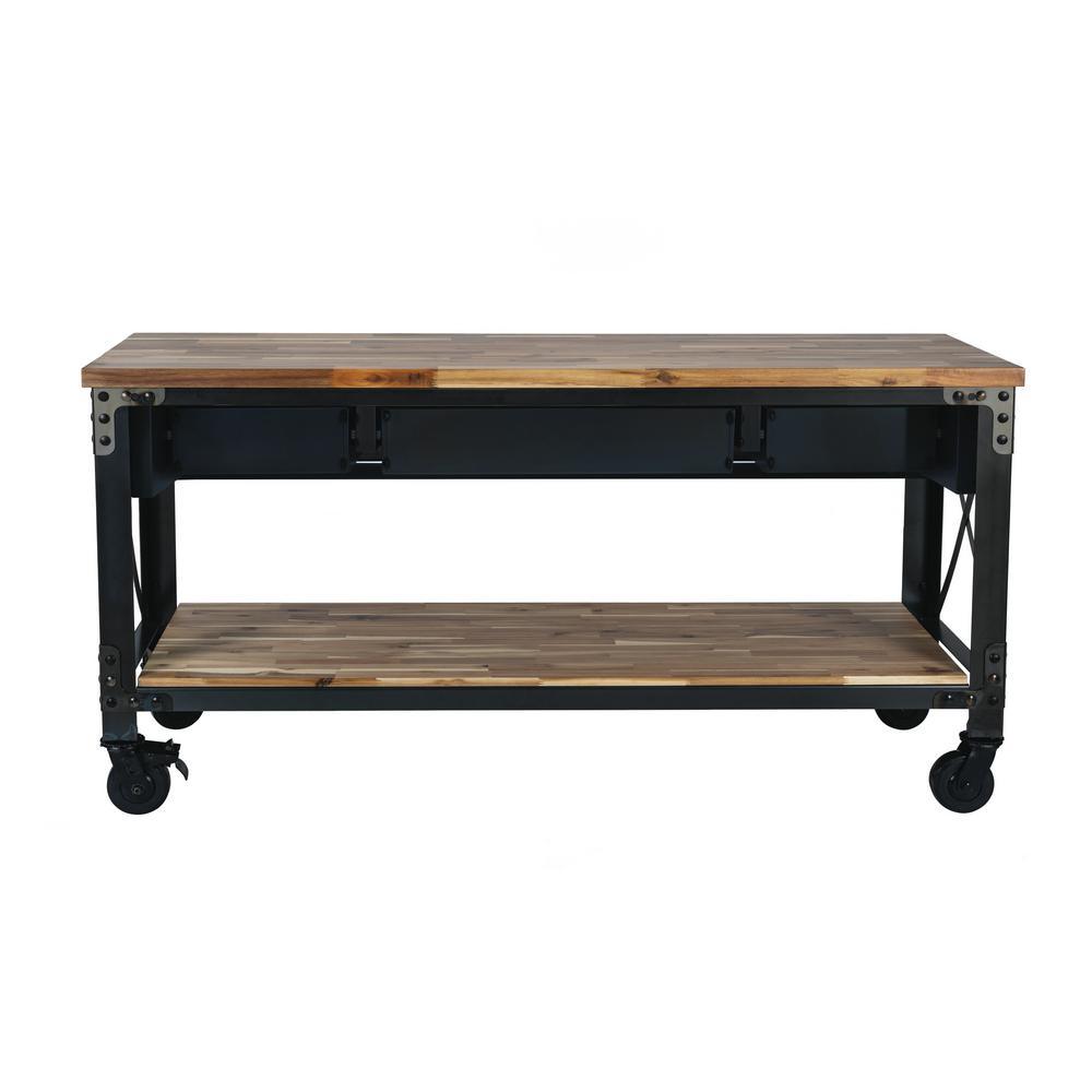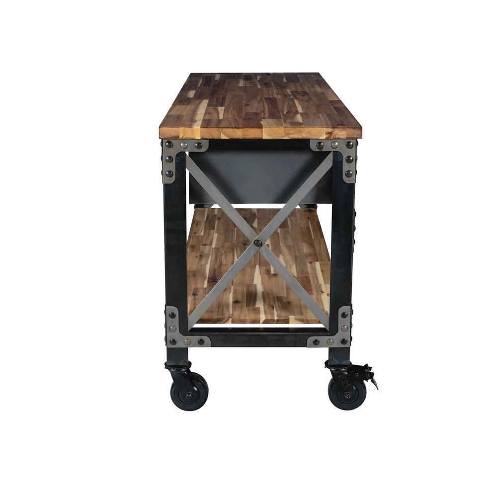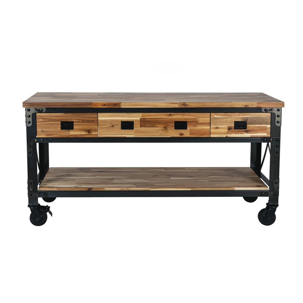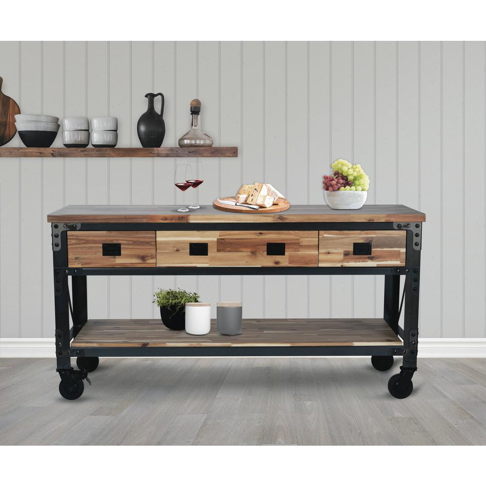 If you are searching for a truly inspired industrial product for your home, then Darby is what you are looking for. with its deeply distressed patina and contrasting colors, it is a piece of furniture that truly depicts industrial style. Ideal for food prepping, at 37 in. H it is more than just a kitchen island, it can also be used as a buffet, bar, desk or console. Strong and sturdy, the frame is made of steel and comes with a solid wood natural finish acacia top that provides a large work surface. The 3-drawers and lower wood shelf provide additional storage space.