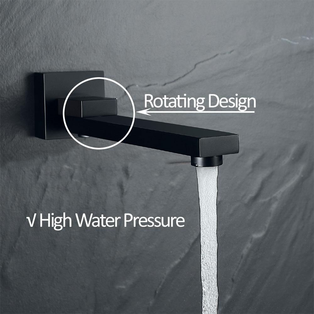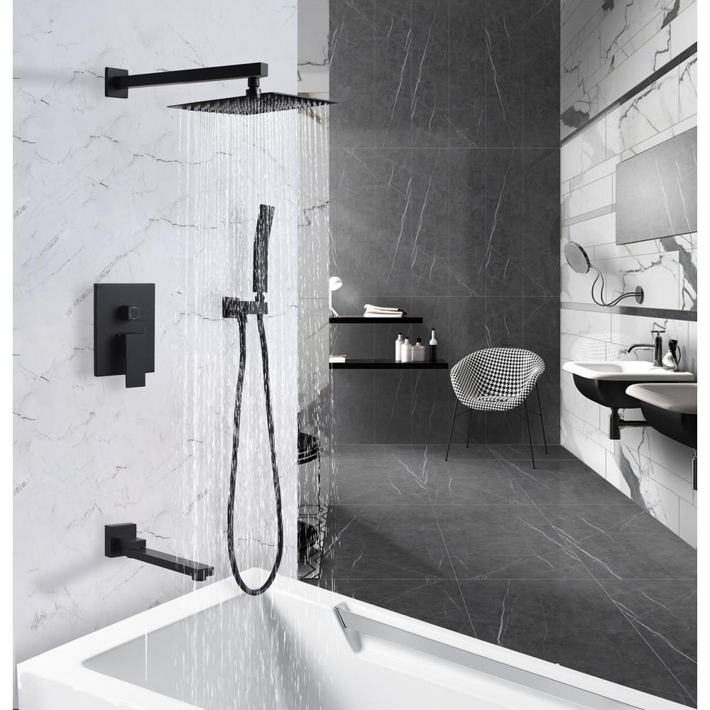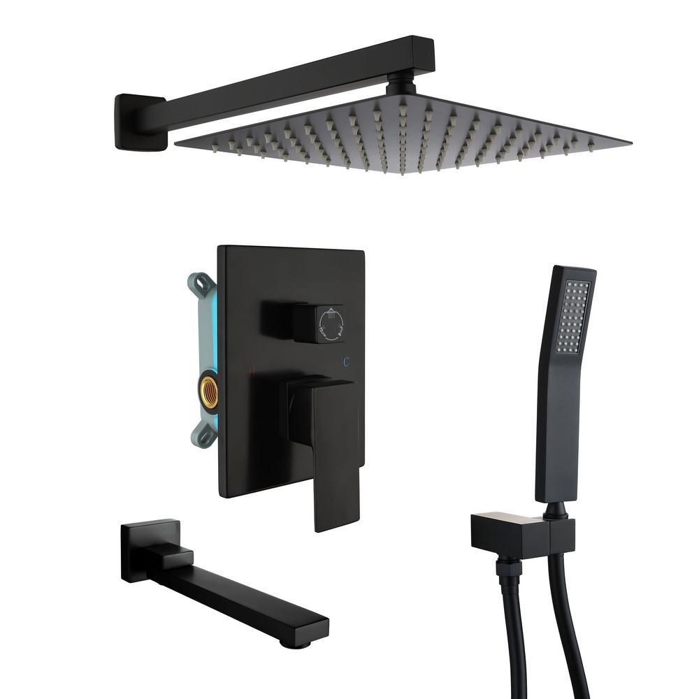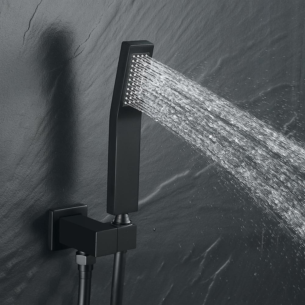 • Professional Technology and High Quality -- All parts of this 3-mode rainfall shower system are made of high-quality materials with professional technology. Those parts include 10-inch square rain shower head, handheld shower head, tub spout, 15 inches shower head arm, shower holder, pre-embedded anti-scald valve, and 60 inches shower hose. The matte black finish and brass combination offers anti- corrosion and classical looking.