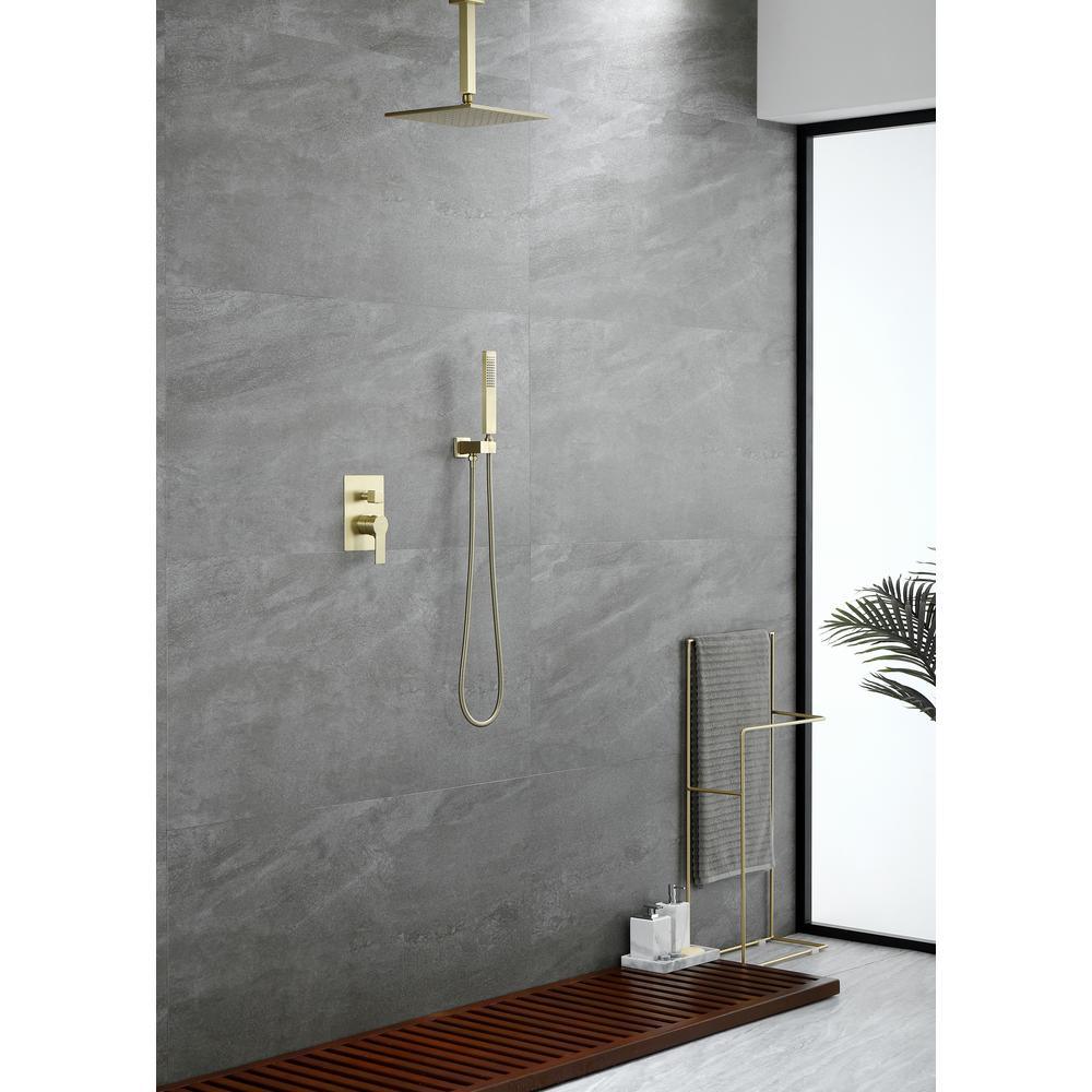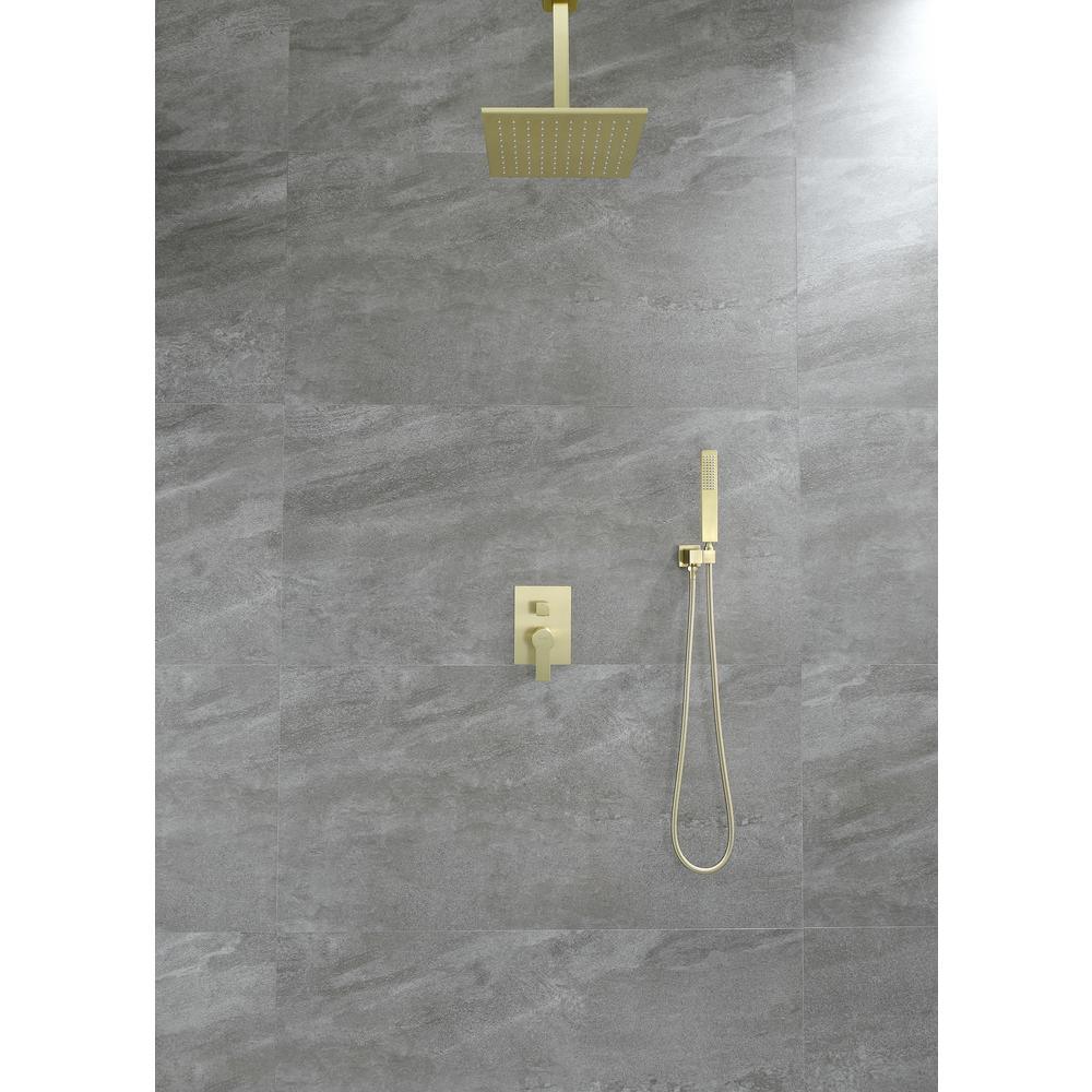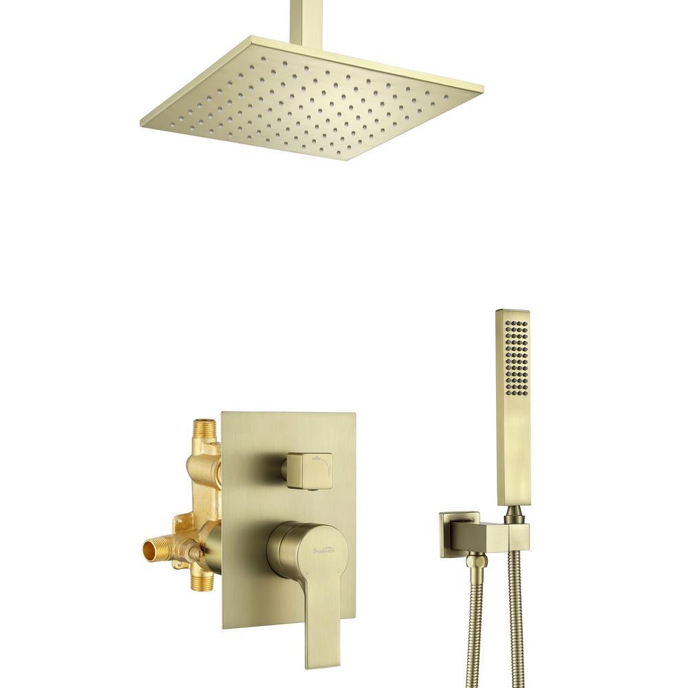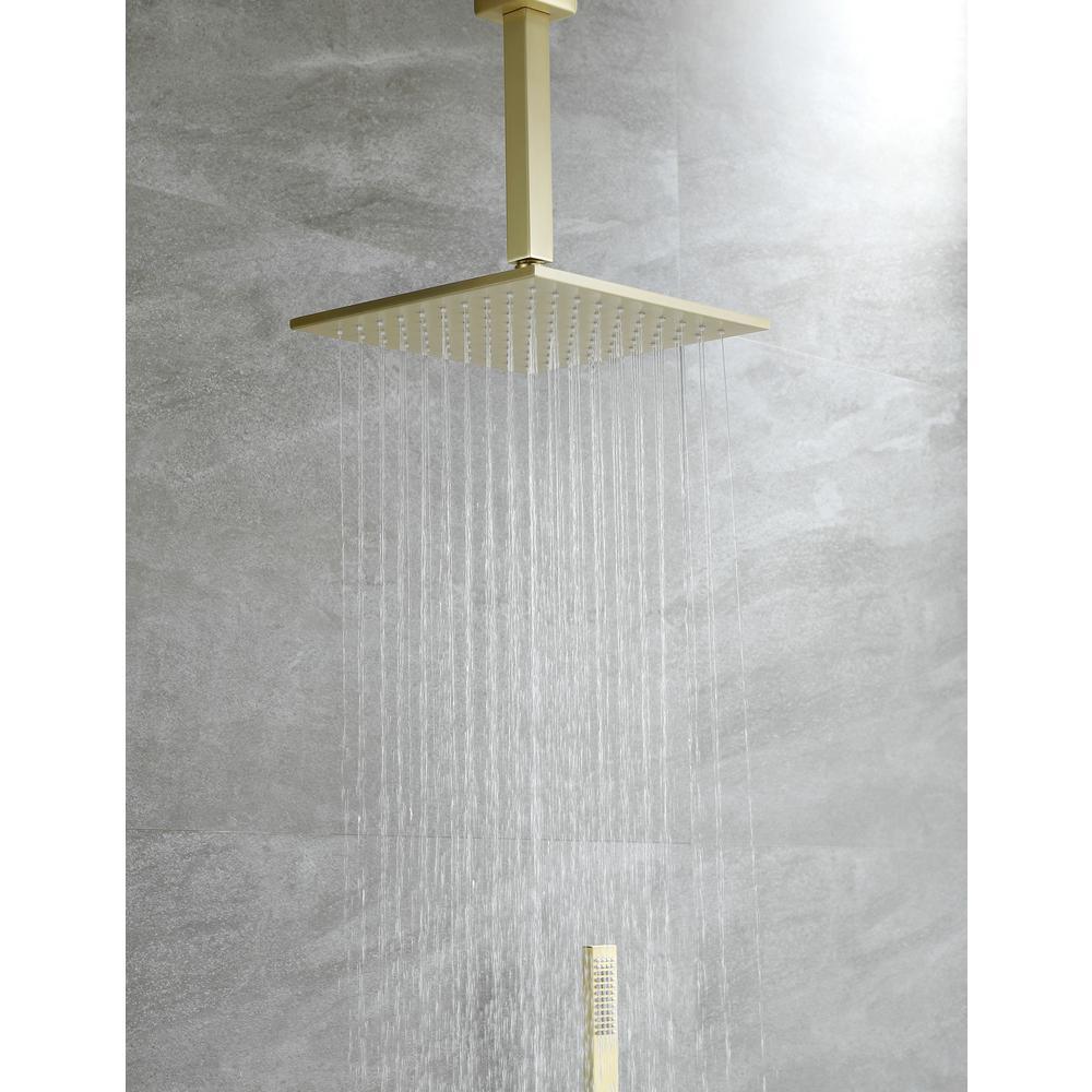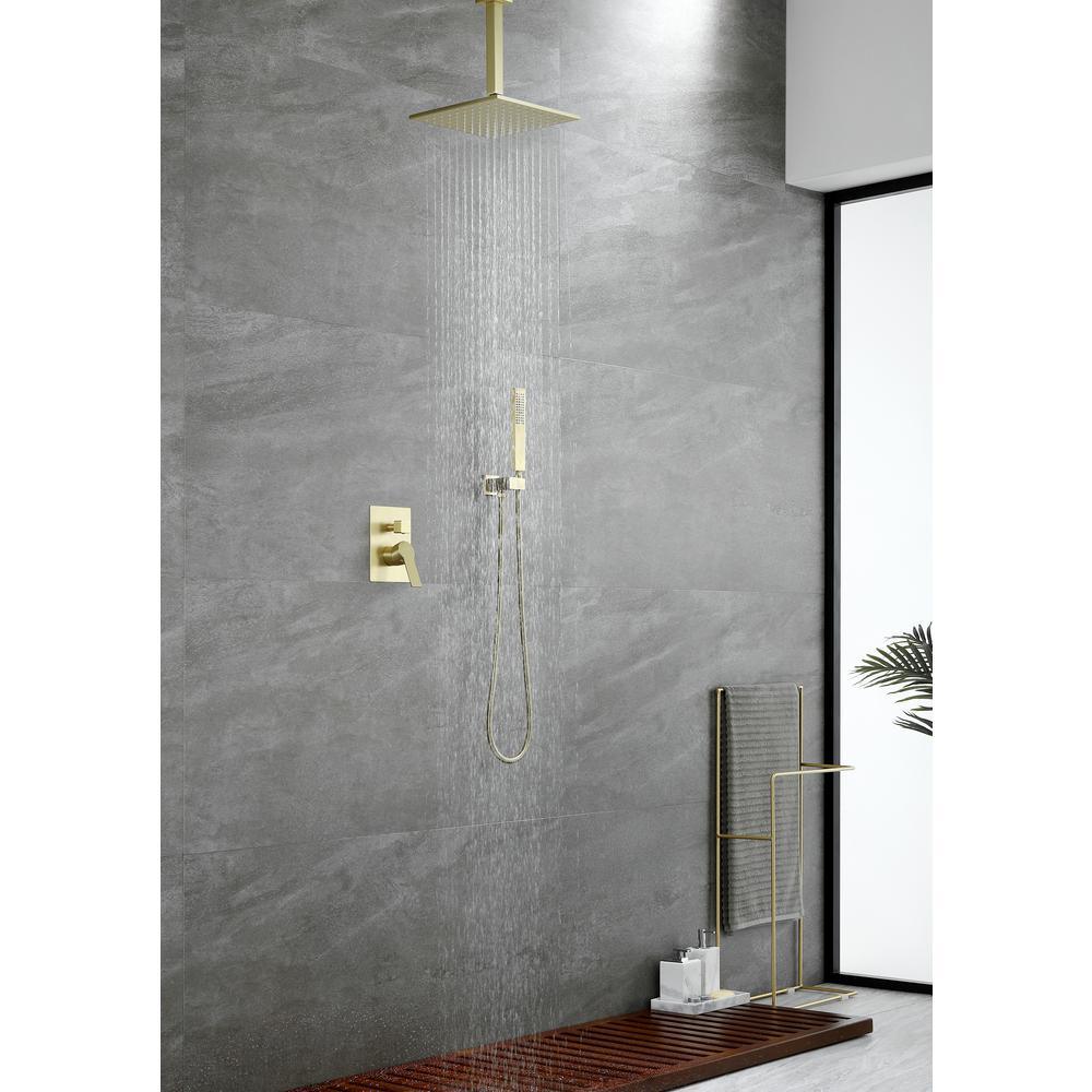 1-Spray Patterns with 2.38 GPM 10 in. Ceiling Mount Dual Shower Heads with Rough-In Valve Body and Trim in Brushed Gold