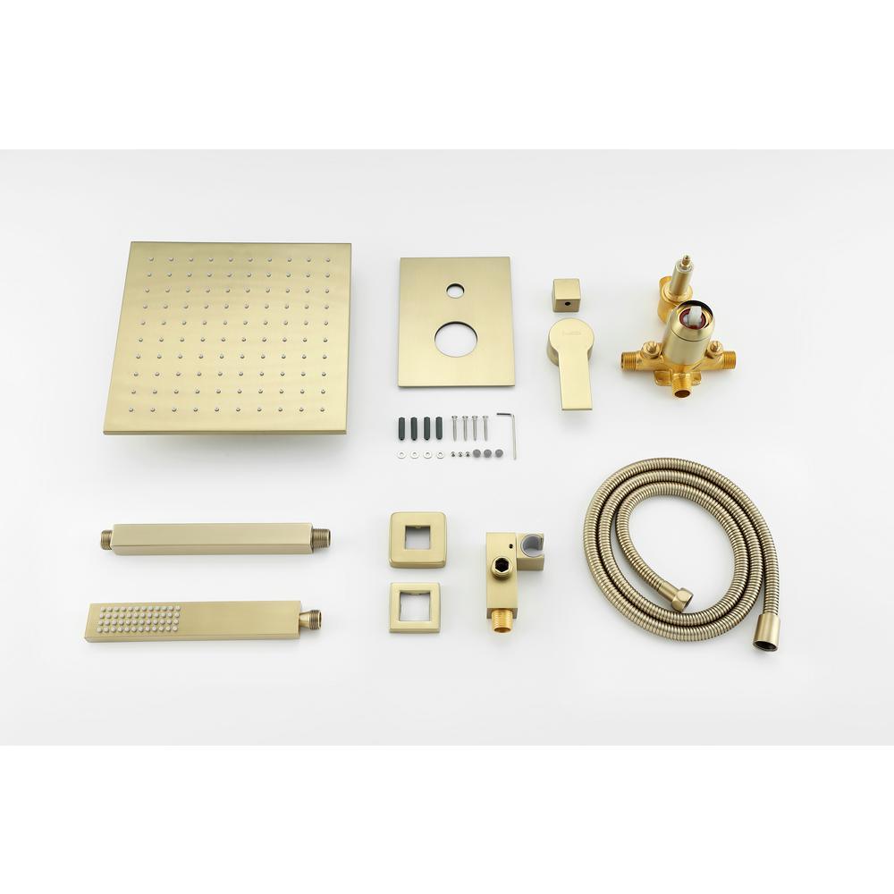 • 【The Premium Shower Fixture Including】 10 in. square rain shower head(Brass), handheld shower head(Brass), 7.9 in. shower arm(Brass), 59 inches shower hose(SUS304 Stainless steel), shower holder(Brass), shower mixer valve body(Brass) and other necessary installation parts