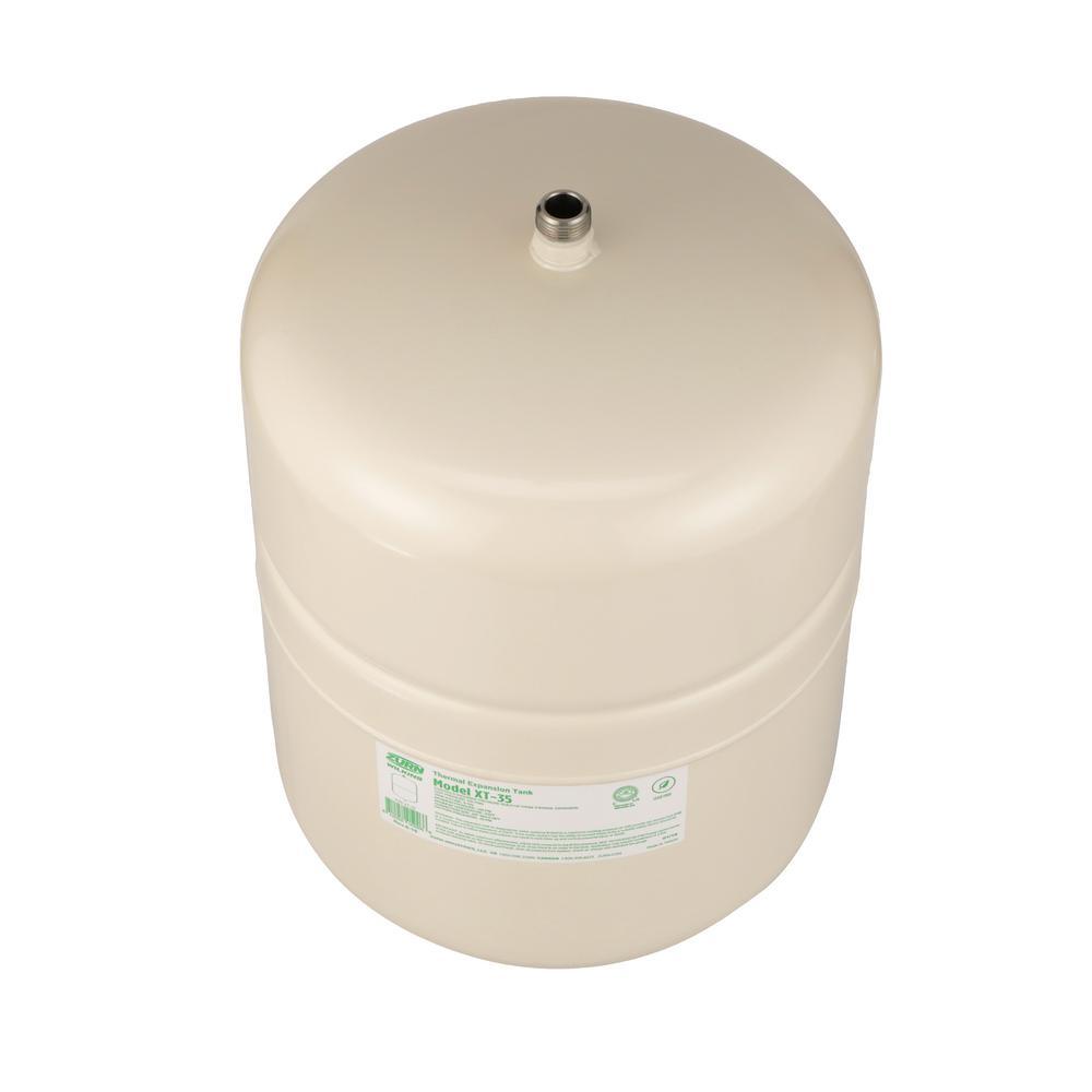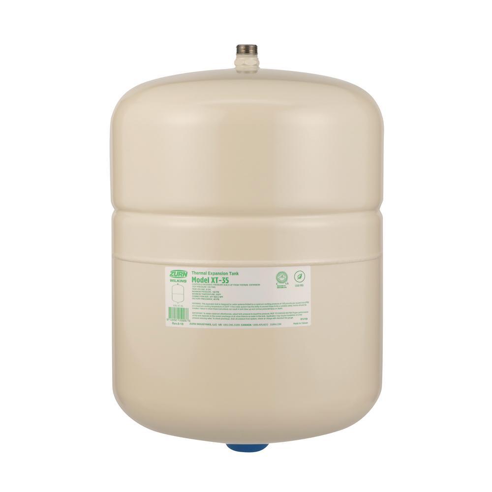 The 9 Gal. XT-35 Thermal Expansion Tank is utilized on potable water lines between the backflow preventer or pressure reducing valve and the water heater for protection against water thermal expansion in residential applications. As the system pressure increases, water enters the polypropylene-lined water chamber of the tank, expanding a diaphragm into a pre-charged air chamber to keep the system pressure below the relief valve setting. Materials include a carbon steel shell with an epoxy finished coating, and corrosion-resistant stainless steel connection with a polypropylene liner and Butyl rubber diaphragm.