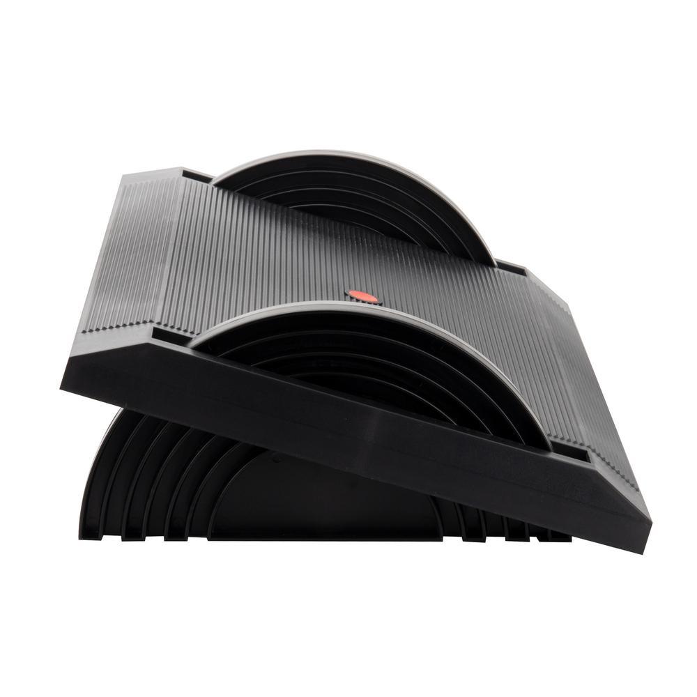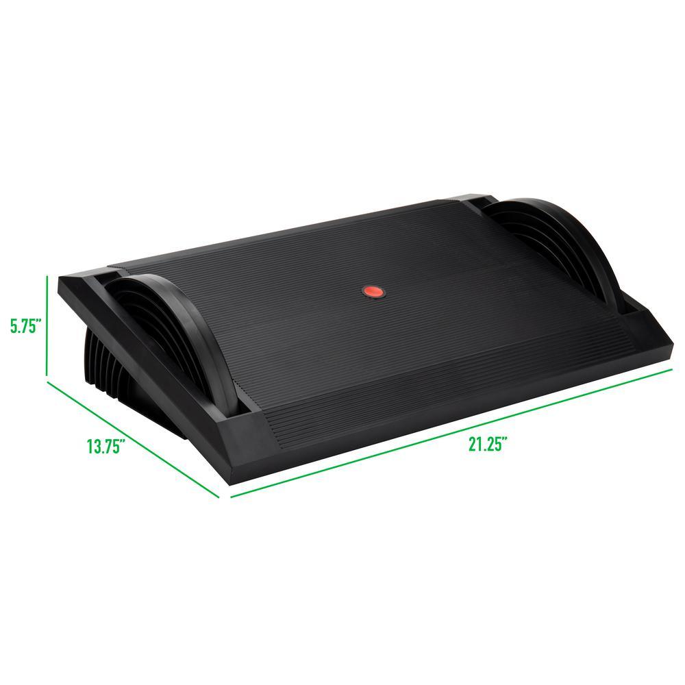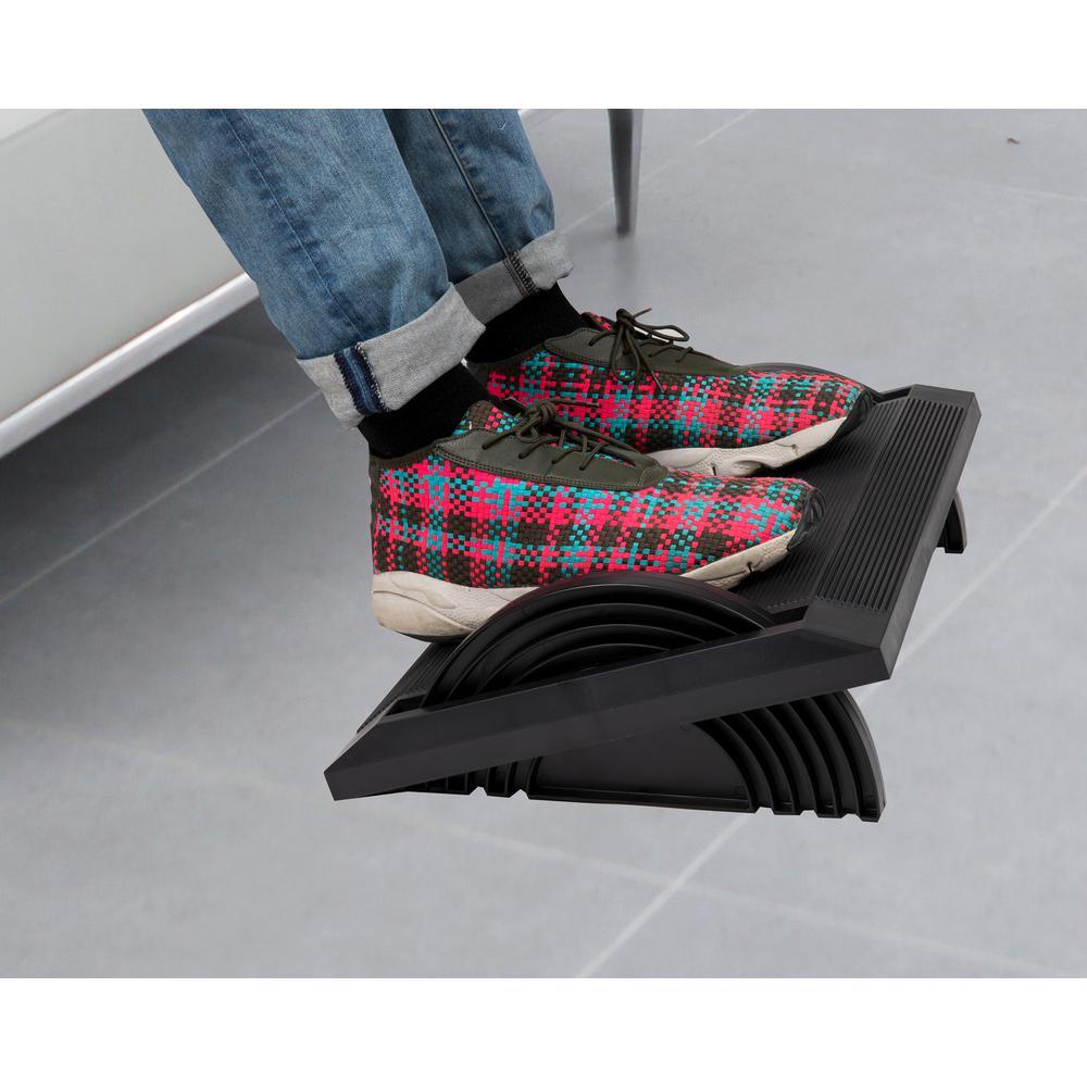 Encourage proper posture while sitting with a Mind Reader Adjustable Footrest. Whether you're working from home or the office, sitting down at a desk for extended periods can often result in muscle aches and pains throughout the body. Ideally, you should be sitting at your desk with your legs at a 90-degree right angle to maintain comfort and circulation throughout the day. Many individuals struggle to sustain this posture due to having chairs at an unsuitable height or legs being too short or too long to accommodate sitting. Enter the active footrest, which can help put your legs at the correct height and angle to preserve the proper form and alleviate tension and muscle pain. This sturdy ergonomic footrest allows you to rest your feet comfortably at an angle conducive to proper posture, without having your legs dangling in the air or stretched out awkwardly. Tilt the footrest backward and forward throughout the day to engage your leg muscles and keep the blood flowing through your extremities. The textured surface helps to massage the soles of your feet while simultaneously preventing them from slipping. The plastic material provides strong, lightweight support, making the footrest easy to take with you to the office or traveling. Create a comfortable sitting situation with an active footrest from Mind Reader Products.