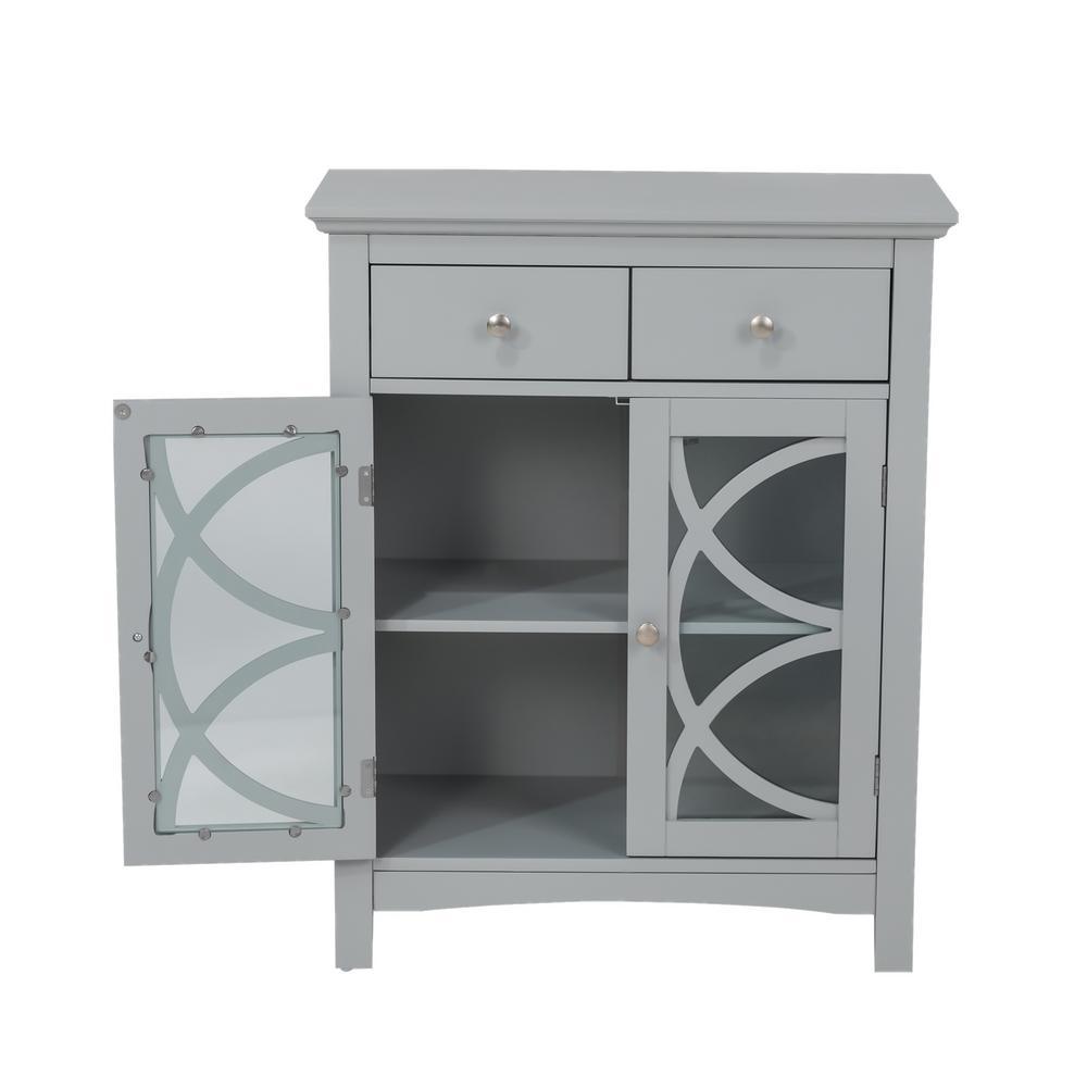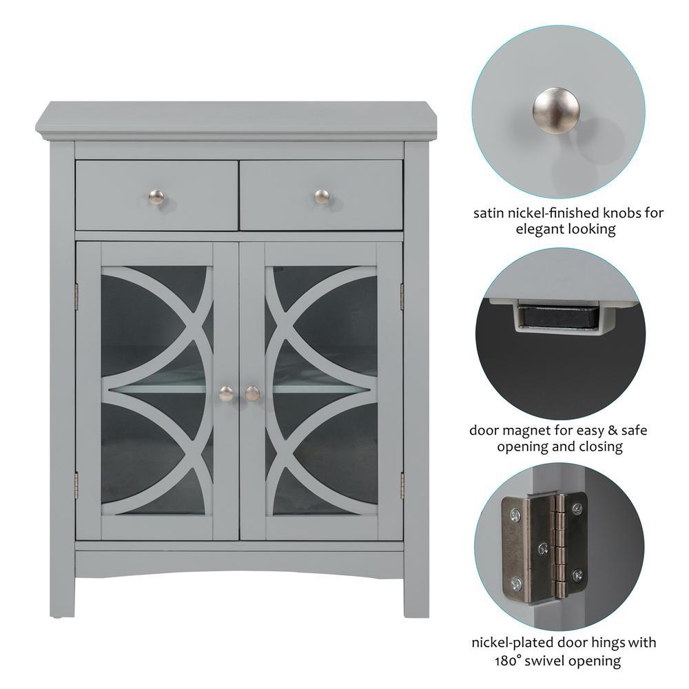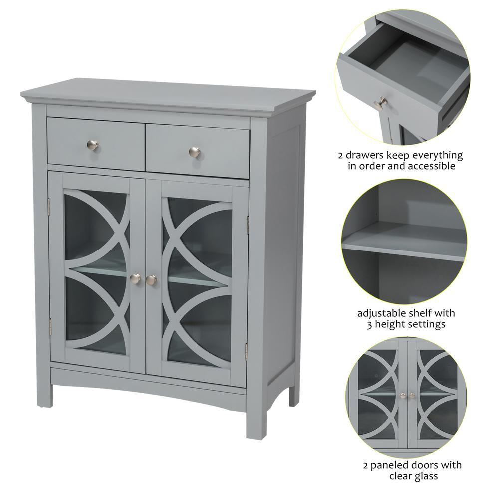 • Ample storage space: features two glass doors, 2-drawers and one enclosed adjustable shelf to place dinnerware, potpourri, soap, tissues and other decorative items