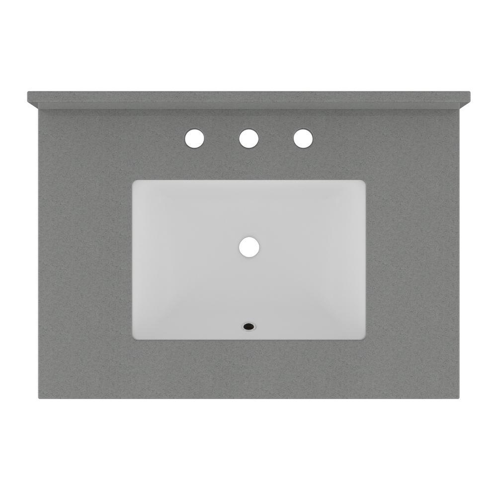 Add a new elegance to your bathroom with a gorgeous new quartz vanity top. The Galaxy Grey Quartz vanity top features pre-attached large rectangular white vitreous china trough bowl and standard edge profile. Perfect addition to an old vanity needing an update or a new vanity, this vanity top will polish off any bathroom.
